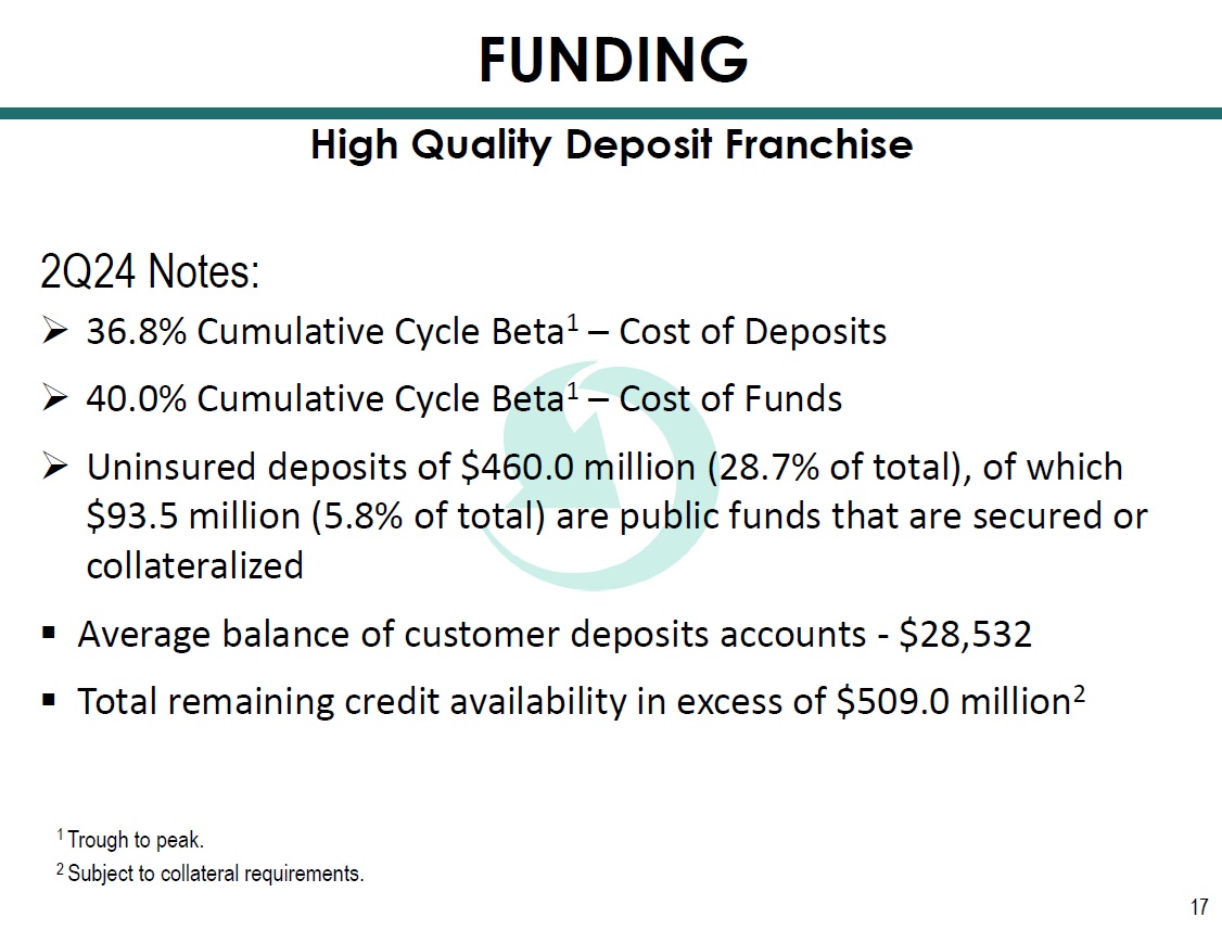 Total Deposit Cost 0.20% 0.11% 0.25% 1.69% 1.98% Non - Interest Bearing 32% 33% 33% 29% 29% Millions $1,230.3 $1,415.5 $1,454.1 $1,573.9 (4 th Quarter for 2020 - 2023 & 2 nd Quarter for 2024) 16 High Quality Deposit Franchise $1,663.8 FUNDING 12/31/2020 12/31/2021 12/31/2022 12/31/2023 06/30/2 024