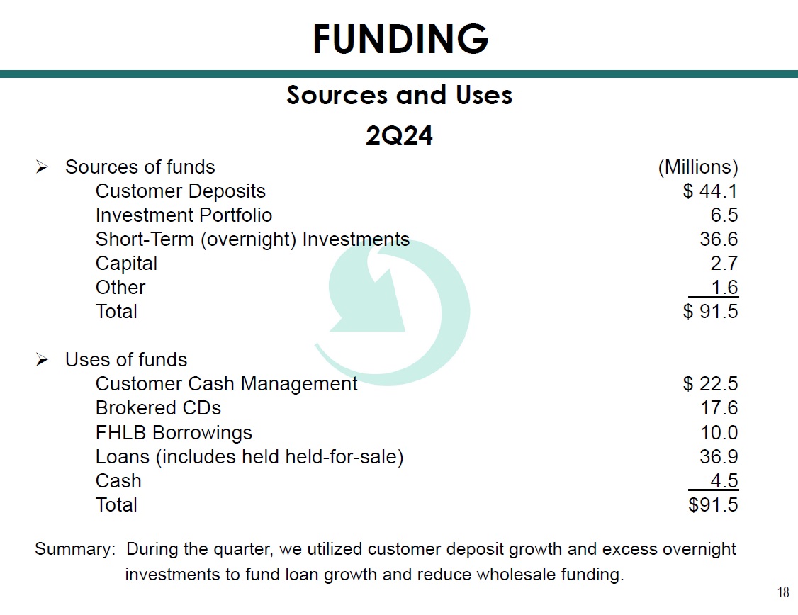 18 2Q24 » Sources of funds (Millions) Customer Deposits $ 44.1 Investment Portfolio 6.5 Short - Term (overnight) Investments 36.6 Capital 2.7 Other 1.6 Total $ 91.5 » Uses of funds Customer Cash Management $ 22.5 Brokered CDs 17.6 FHLB Borrowings 10.0 Loans (includes held held - for - sale) 36.9 Cash 4.5 Total $91.5 Summary: During the quarter, we utilized customer deposit growth and excess overnight investments to fund loan growth and reduce wholesale funding. Sources and Uses FUNDING