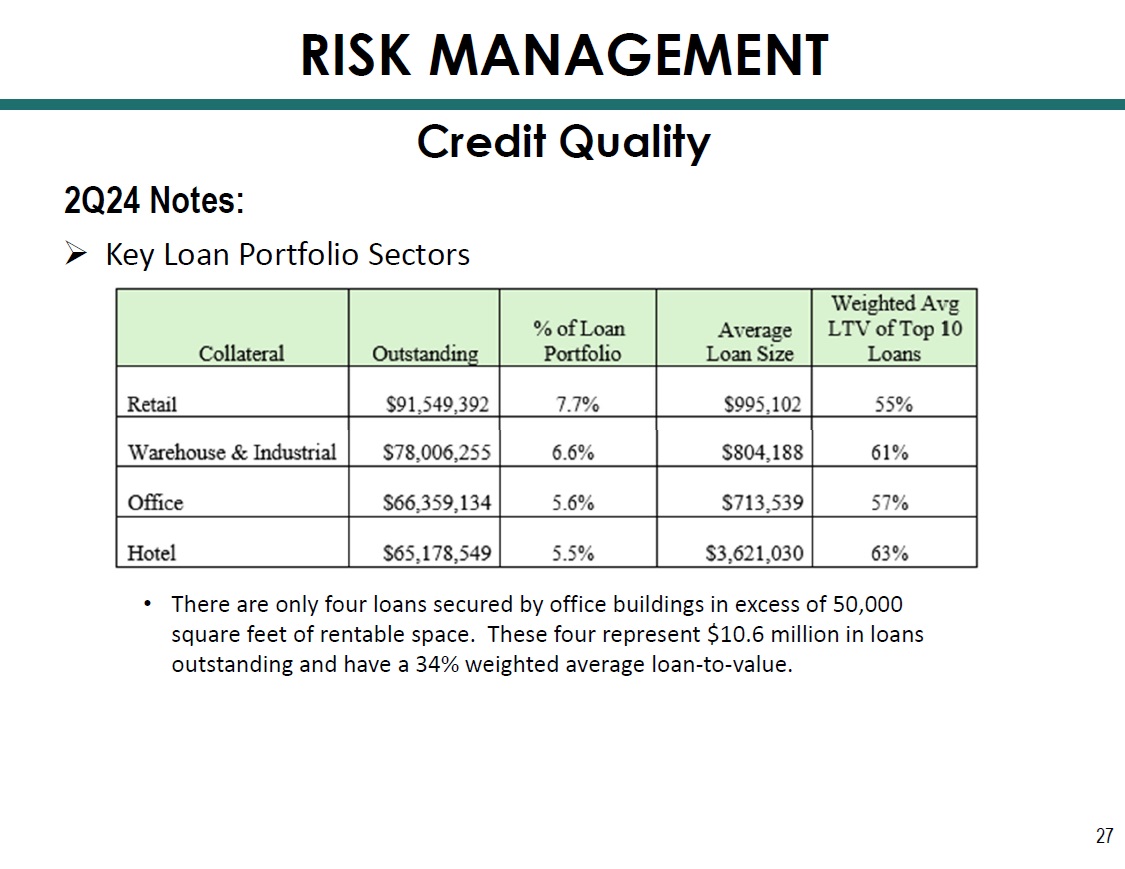 2Q24 Notes: » Key Loan Portfolio Sectors 27 • There are only four loans secured by office buildings in excess of 50,000 square feet of rentable space. These four represent $10.6 million in loans outstanding and have a 34% weighted average loan - to - value. Credit Quality RISK MANAGEMENT