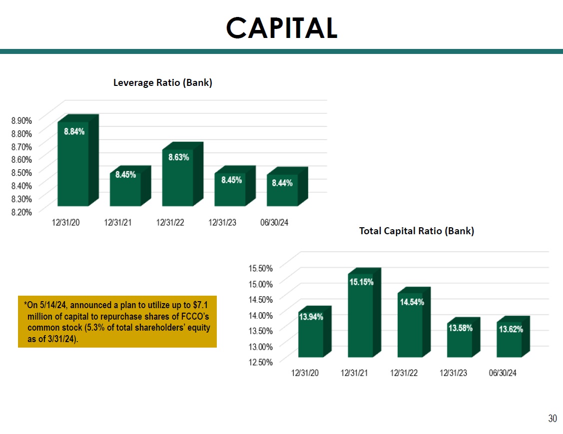 30 Leverage Ratio (Bank) Total Capital Ratio (Bank) CAPITAL *On 5/14/24, announced a plan to utilize up to $7.1 million of capital to repurchase shares of FCCO’s common stock (5.3% of total shareholders’ equity as of 3/31/24).
