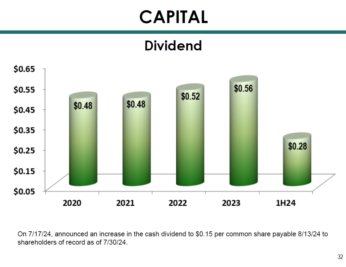 Dividend 32 CAPITAL On 7/17/24, a nnounced an increase in the cash dividend to $0.15 per common share payable 8/13/24 to shareholders of record as of 7/30/24.