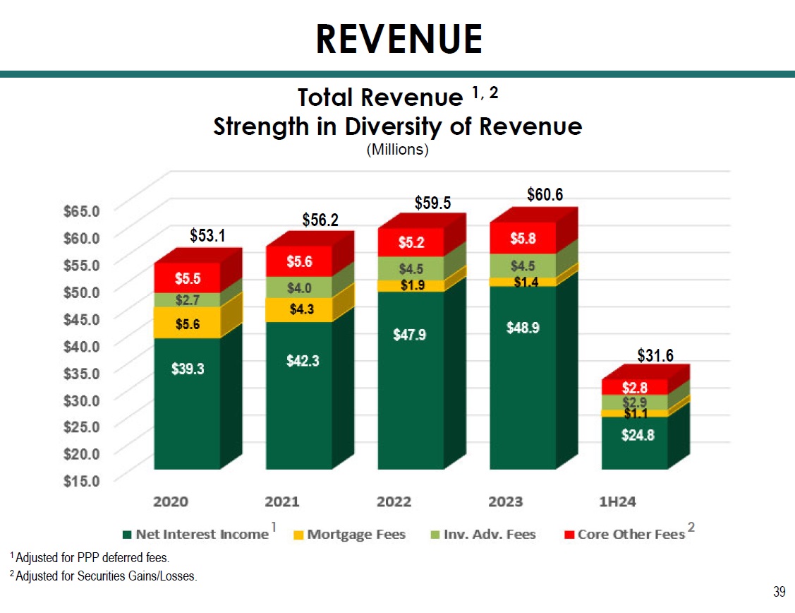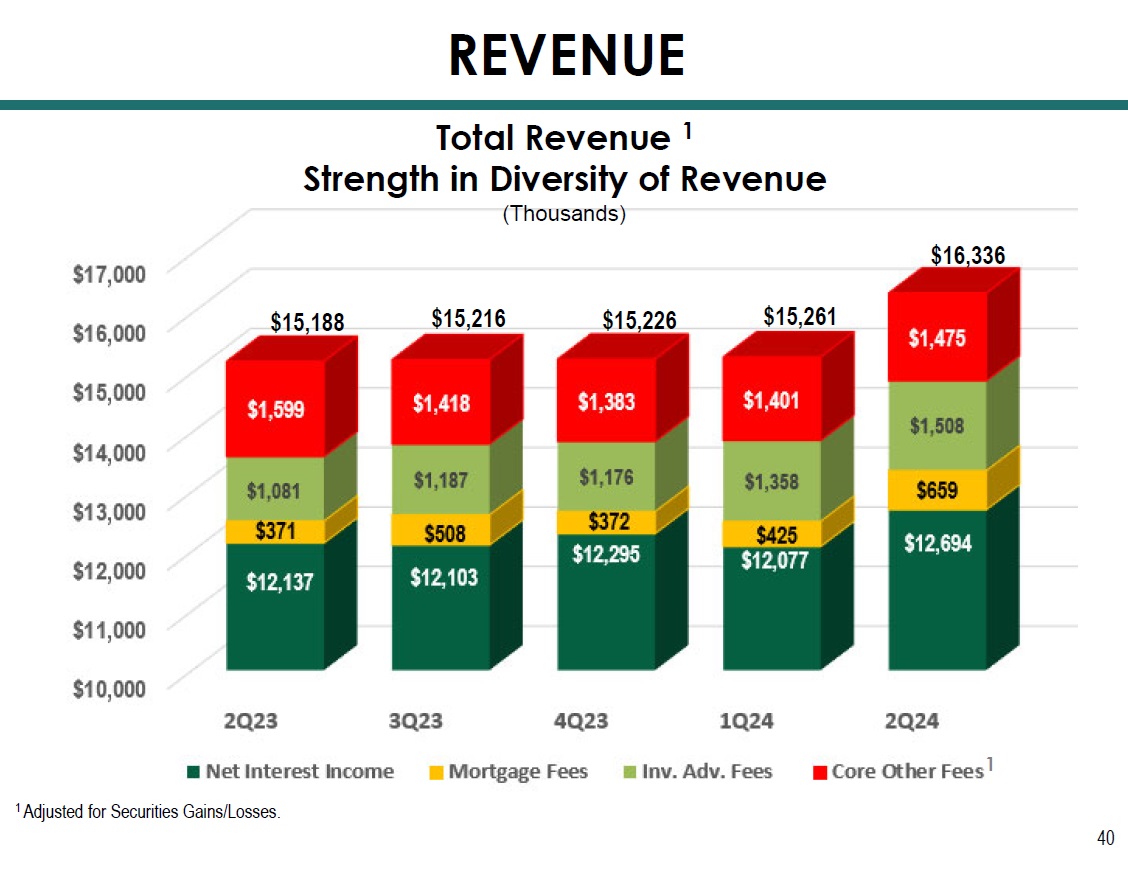 39 (Millions) $53.1 $56.2 $60.6 $59.5 Total Revenue 1, 2 Strength in Diversity of Revenue REVENUE 1 Adjusted for PPP deferred fees. 2 Adjusted for Securities Gains/Losses. 2 1 $31.6