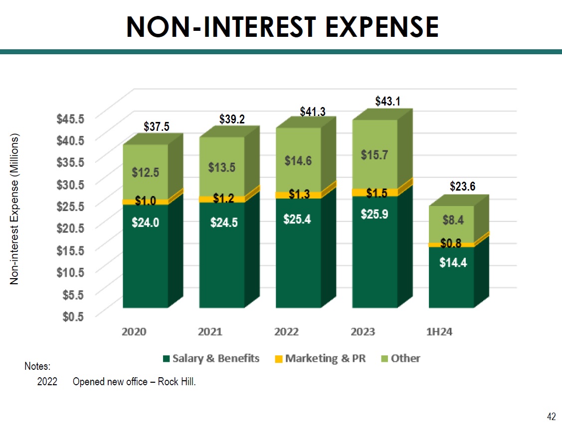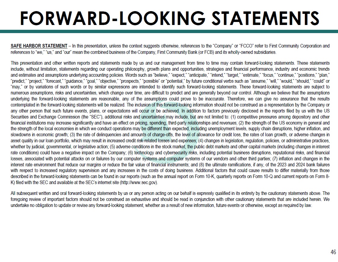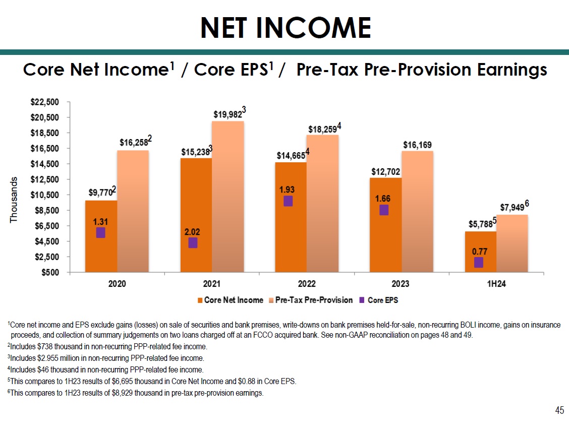 1 Core net income and EPS exclude gains (losses) on sale of securities and bank premises, write - downs on bank premises held - for - sa le, non - recurring BOLI income, gains on insurance proceeds, and collection of summary judgements on two loans charged off at an FCCO acquired bank. S ee non - GAAP reconciliation on pages 48 and 49. 2 Includes $738 thousand in non - recurring PPP - related fee income. 3 Includes $2.955 million in non - recurring PPP - related fee income. 4 Includes $46 thousand in non - recurring PPP - related fee income. 5 This compares to 1H23 results of $6,695 thousand in Core Net Income and $0.88 in Core EPS. 6 This compares to 1H23 results of $8,929 thousand in pre - tax pre - provision earnings. Thousands Core Net Income 1 / Core EPS 1 / Pre - Tax Pre - Provision Earnings 45 NET INCOME 2 3 2 3 4 4 5 6