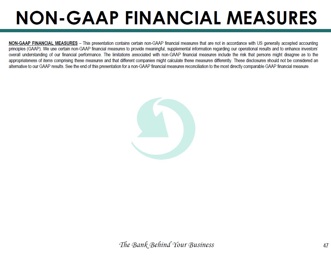 NON - GAAP FINANCIAL MEASURES The Bank Behind Your Business 47 NON - GAAP FINANCIAL MEASURES – This presentation contains certain non - GAAP financial measures that are not in accordance with US generally accepted accounting principles (GAAP) . We use certain non - GAAP financial measures to provide meaningful, supplemental information regarding our operational results and to enhance investors’ overall understanding of our financial performance . The limitations associated with non - GAAP financial measures include the risk that persons might disagree as to the appropriateness of items comprising these measures and that different companies might calculate these measures differently . These disclosures should not be considered an alternative to our GAAP results . See the end of this presentation for a non - GAAP financial measures reconciliation to the most directly comparable GAAP financial measure .