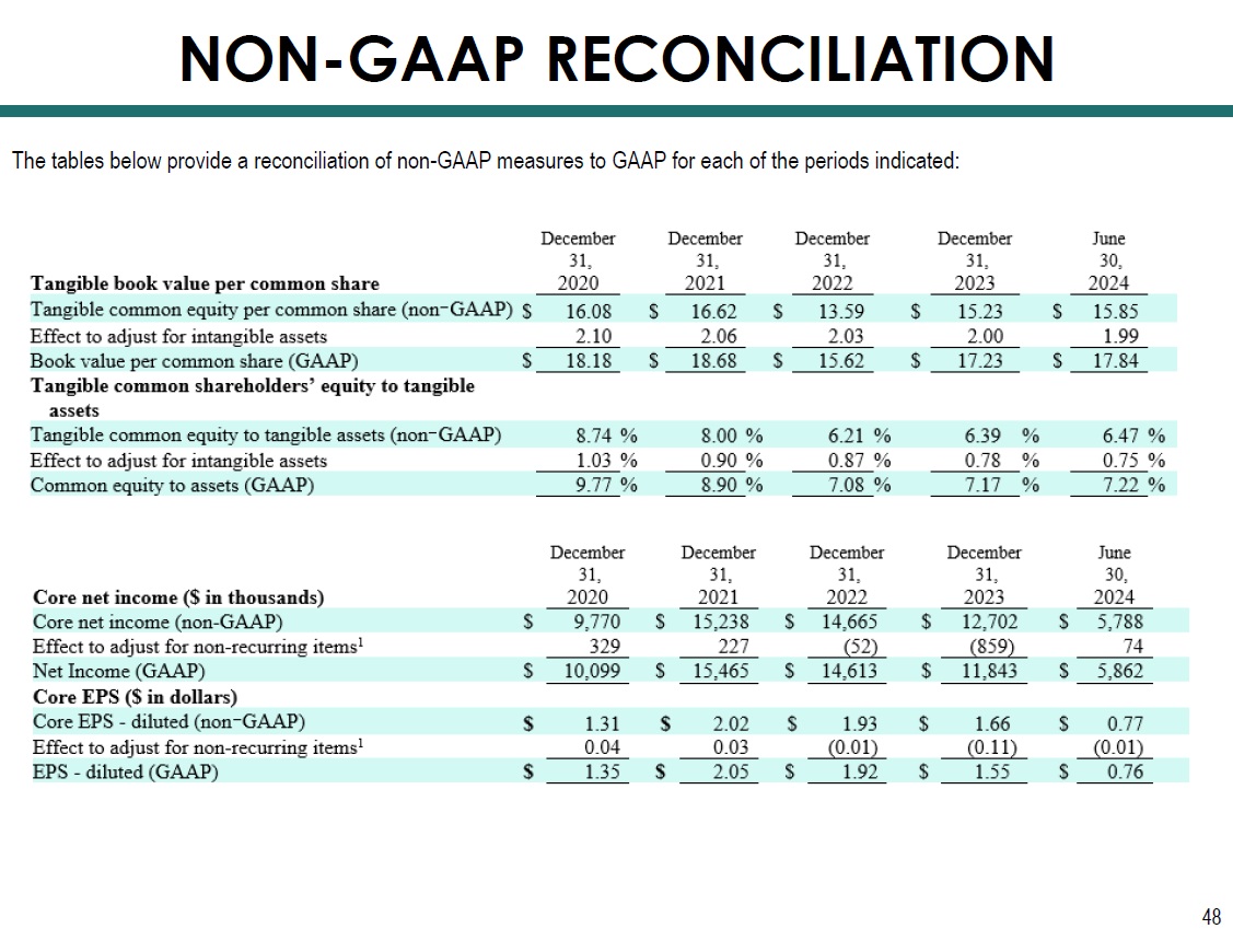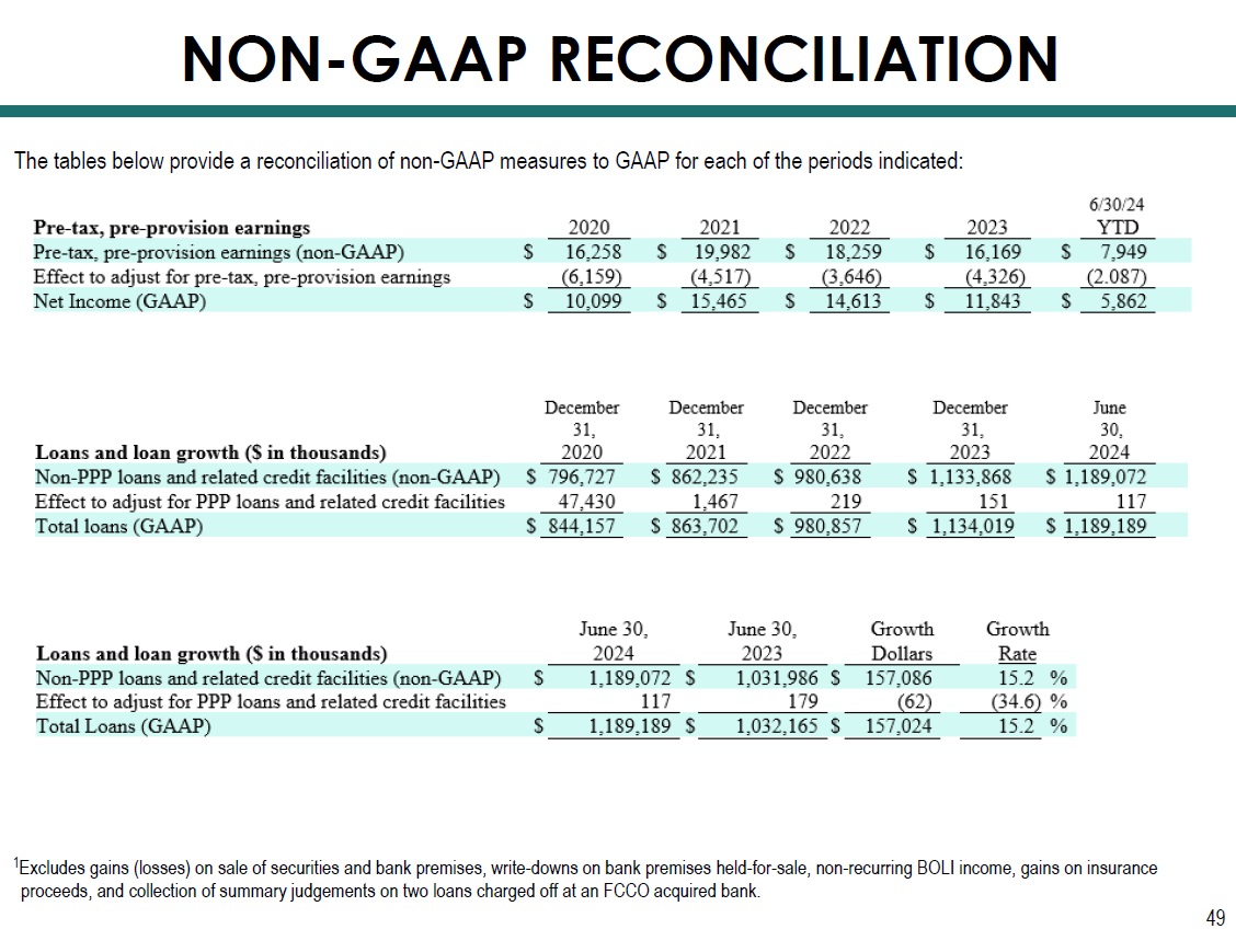 NON - GAAP RECONCILIATION 49 1 Excludes gains (losses) on sale of securities and bank premises, write - downs on bank premises held - for - sale, non - recurring BOLI income, gains on insurance proceeds, and collection of summary judgements on two loans charged off at an FCCO acquired bank. The tables below provide a reconciliation of non - GAAP measures to GAAP for each of the periods indicated: