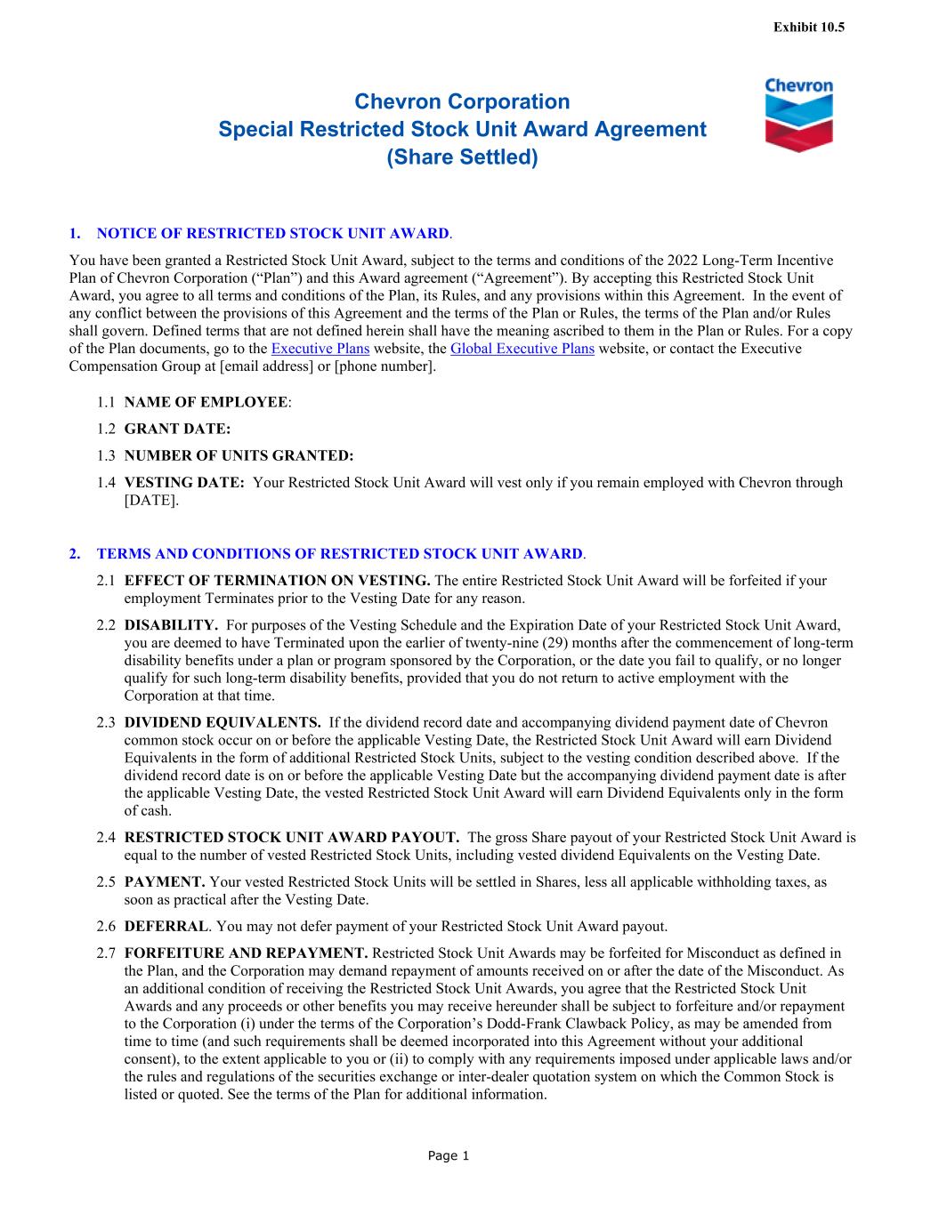 Page 1 Chevron Corporation Special Restricted Stock Unit Award Agreement (Share Settled) Exhibit 10.5 1. NOTICE OF RESTRICTED STOCK UNIT AWARD. You have been granted a Restricted Stock Unit Award, subject to the terms and conditions of the 2022 Long-Term Incentive Plan of Chevron Corporation (“Plan”) and this Award agreement (“Agreement”). By accepting this Restricted Stock Unit Award, you agree to all terms and conditions of the Plan, its Rules, and any provisions within this Agreement. In the event of any conflict between the provisions of this Agreement and the terms of the Plan or Rules, the terms of the Plan and/or Rules shall govern. Defined terms that are not defined herein shall have the meaning ascribed to them in the Plan or Rules. For a copy of the Plan documents, go to the Executive Plans website, the Global Executive Plans website, or contact the Executive Compensation Group at [email address] or [phone number]. 1.1 NAME OF EMPLOYEE: 1.2 GRANT DATE: 1.3 NUMBER OF UNITS GRANTED: 1.4 VESTING DATE: Your Restricted Stock Unit Award will vest only if you remain employed with Chevron through [DATE]. 2. TERMS AND CONDITIONS OF RESTRICTED STOCK UNIT AWARD. 2.1 EFFECT OF TERMINATION ON VESTING. The entire Restricted Stock Unit Award will be forfeited if your employment Terminates prior to the Vesting Date for any reason. 2.2 DISABILITY. For purposes of the Vesting Schedule and the Expiration Date of your Restricted Stock Unit Award, you are deemed to have Terminated upon the earlier of twenty-nine (29) months after the commencement of long-term disability benefits under a plan or program sponsored by the Corporation, or the date you fail to qualify, or no longer qualify for such long-term disability benefits, provided that you do not return to active employment with the Corporation at that time. 2.3 DIVIDEND EQUIVALENTS. If the dividend record date and accompanying dividend payment date of Chevron common stock occur on or before the applicable Vesting Date, the Restricted Stock Unit Award will earn Dividend Equivalents in the form of additional Restricted Stock Units, subject to the vesting condition described above. If the dividend record date is on or before the applicable Vesting Date but the accompanying dividend payment date is after the applicable Vesting Date, the vested Restricted Stock Unit Award will earn Dividend Equivalents only in the form of cash. 2.4 RESTRICTED STOCK UNIT AWARD PAYOUT. The gross Share payout of your Restricted Stock Unit Award is equal to the number of vested Restricted Stock Units, including vested dividend Equivalents on the Vesting Date. 2.5 PAYMENT. Your vested Restricted Stock Units will be settled in Shares, less all applicable withholding taxes, as soon as practical after the Vesting Date. 2.6 DEFERRAL. You may not defer payment of your Restricted Stock Unit Award payout. 2.7 FORFEITURE AND REPAYMENT. Restricted Stock Unit Awards may be forfeited for Misconduct as defined in the Plan, and the Corporation may demand repayment of amounts received on or after the date of the Misconduct. As an additional condition of receiving the Restricted Stock Unit Awards, you agree that the Restricted Stock Unit Awards and any proceeds or other benefits you may receive hereunder shall be subject to forfeiture and/or repayment to the Corporation (i) under the terms of the Corporation’s Dodd-Frank Clawback Policy, as may be amended from time to time (and such requirements shall be deemed incorporated into this Agreement without your additional consent), to the extent applicable to you or (ii) to comply with any requirements imposed under applicable laws and/or the rules and regulations of the securities exchange or inter-dealer quotation system on which the Common Stock is listed or quoted. See the terms of the Plan for additional information.