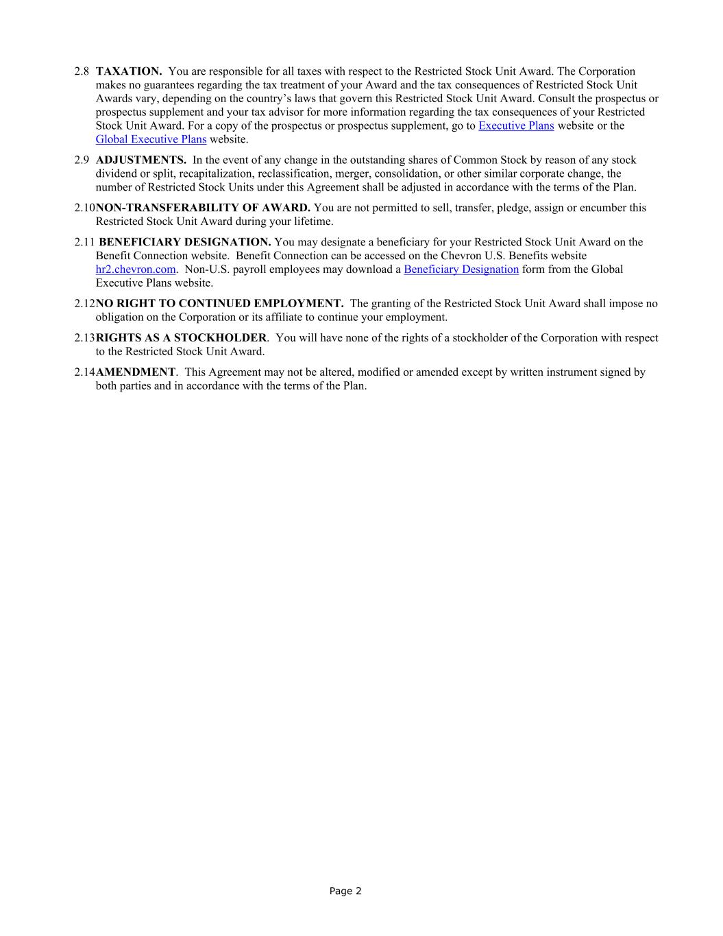 Page 2 2.8 TAXATION. You are responsible for all taxes with respect to the Restricted Stock Unit Award. The Corporation makes no guarantees regarding the tax treatment of your Award and the tax consequences of Restricted Stock Unit Awards vary, depending on the country’s laws that govern this Restricted Stock Unit Award. Consult the prospectus or prospectus supplement and your tax advisor for more information regarding the tax consequences of your Restricted Stock Unit Award. For a copy of the prospectus or prospectus supplement, go to Executive Plans website or the Global Executive Plans website. 2.9 ADJUSTMENTS. In the event of any change in the outstanding shares of Common Stock by reason of any stock dividend or split, recapitalization, reclassification, merger, consolidation, or other similar corporate change, the number of Restricted Stock Units under this Agreement shall be adjusted in accordance with the terms of the Plan. 2.10 NON-TRANSFERABILITY OF AWARD. You are not permitted to sell, transfer, pledge, assign or encumber this Restricted Stock Unit Award during your lifetime. 2.11 BENEFICIARY DESIGNATION. You may designate a beneficiary for your Restricted Stock Unit Award on the Benefit Connection website. Benefit Connection can be accessed on the Chevron U.S. Benefits website hr2.chevron.com. Non-U.S. payroll employees may download a Beneficiary Designation form from the Global Executive Plans website. 2.12 NO RIGHT TO CONTINUED EMPLOYMENT. The granting of the Restricted Stock Unit Award shall impose no obligation on the Corporation or its affiliate to continue your employment. 2.13 RIGHTS AS A STOCKHOLDER. You will have none of the rights of a stockholder of the Corporation with respect to the Restricted Stock Unit Award. 2.14 AMENDMENT. This Agreement may not be altered, modified or amended except by written instrument signed by both parties and in accordance with the terms of the Plan.