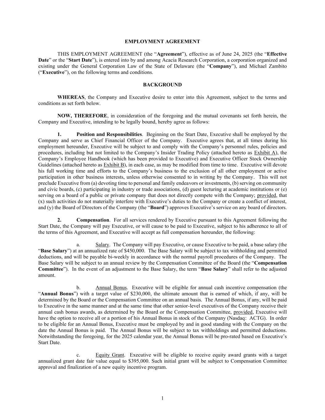 1 EMPLOYMENT AGREEMENT THIS EMPLOYMENT AGREEMENT (the “Agreement”), effective as of June 24, 2025 (the “Effective Date” or the “Start Date”), is entered into by and among Acacia Research Corporation, a corporation organized and existing under the General Corporation Law of the State of Delaware (the “Company”), and Michael Zambito (“Executive”), on the following terms and conditions. BACKGROUND WHEREAS, the Company and Executive desire to enter into this Agreement, subject to the terms and conditions as set forth below. NOW, THEREFORE, in consideration of the foregoing and the mutual covenants set forth herein, the Company and Executive, intending to be legally bound, hereby agree as follows: 1. Position and Responsibilities. Beginning on the Start Date, Executive shall be employed by the Company and serve as Chief Financial Officer of the Company. Executive agrees that, at all times during his employment hereunder, Executive will be subject to and comply with the Company’s personnel rules, policies and procedures, including but not limited to the Company’s Insider Trading Policy (attached hereto as Exhibit A), the Company’s Employee Handbook (which has been provided to Executive) and Executive Officer Stock Ownership Guidelines (attached hereto as Exhibit B), in each case, as may be modified from time to time. Executive will devote his full working time and efforts to the Company’s business to the exclusion of all other employment or active participation in other business interests, unless otherwise consented to in writing by the Company. This will not preclude Executive from (a) devoting time to personal and family endeavors or investments, (b) serving on community and civic boards, (c) participating in industry or trade associations, (d) guest lecturing at academic institutions or (e) serving on a board of a public or private company that does not directly compete with the Company; provided, that (x) such activities do not materially interfere with Executive’s duties to the Company or create a conflict of interest, and (y) the Board of Directors of the Company (the “Board”) approves Executive’s service on any board of directors. 2. Compensation. For all services rendered by Executive pursuant to this Agreement following the Start Date, the Company will pay Executive, or will cause to be paid to Executive, subject to his adherence to all of the terms of this Agreement, and Executive will accept as full compensation hereunder, the following: a. Salary. The Company will pay Executive, or cause Executive to be paid, a base salary (the “Base Salary”) at an annualized rate of $450,000. The Base Salary will be subject to tax withholding and permitted deductions, and will be payable bi-weekly in accordance with the normal payroll procedures of the Company. The Base Salary will be subject to an annual review by the Compensation Committee of the Board (the “Compensation Committee”). In the event of an adjustment to the Base Salary, the term “Base Salary” shall refer to the adjusted amount. b. Annual Bonus. Executive will be eligible for annual cash incentive compensation (the “Annual Bonus”) with a target value of $230,000, the ultimate amount that is earned of which, if any, will be determined by the Board or the Compensation Committee on an annual basis. The Annual Bonus, if any, will be paid to Executive in the same manner and at the same time that other senior-level executives of the Company receive their annual cash bonus awards, as determined by the Board or the Compensation Committee, provided, Executive will have the option to receive all or a portion of his Annual Bonus in stock of the Company (Nasdaq: ACTG). In order to be eligible for an Annual Bonus, Executive must be employed by and in good standing with the Company on the date the Annual Bonus is paid. The Annual Bonus will be subject to tax withholdings and permitted deductions. Notwithstanding the foregoing, for the 2025 calendar year, the Annual Bonus will be pro-rated based on Executive’s Start Date. c. Equity Grant. Executive will be eligible to receive equity award grants with a target annualized grant date fair value equal to $395,000. Such initial grant will be subject to Compensation Committee approval and finalization of a new equity incentive program.