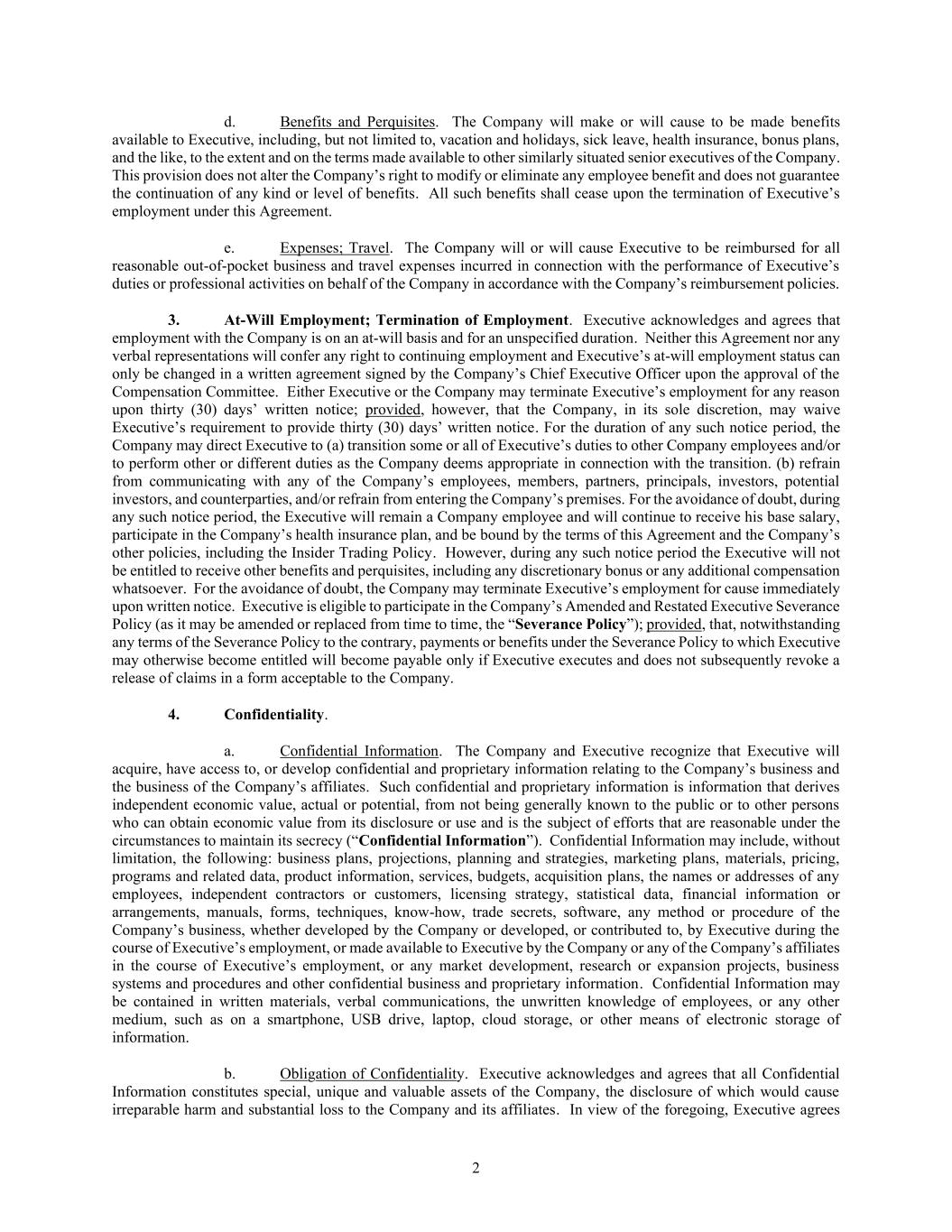 2 d. Benefits and Perquisites. The Company will make or will cause to be made benefits available to Executive, including, but not limited to, vacation and holidays, sick leave, health insurance, bonus plans, and the like, to the extent and on the terms made available to other similarly situated senior executives of the Company. This provision does not alter the Company’s right to modify or eliminate any employee benefit and does not guarantee the continuation of any kind or level of benefits. All such benefits shall cease upon the termination of Executive’s employment under this Agreement. e. Expenses; Travel. The Company will or will cause Executive to be reimbursed for all reasonable out-of-pocket business and travel expenses incurred in connection with the performance of Executive’s duties or professional activities on behalf of the Company in accordance with the Company’s reimbursement policies. 3. At-Will Employment; Termination of Employment. Executive acknowledges and agrees that employment with the Company is on an at-will basis and for an unspecified duration. Neither this Agreement nor any verbal representations will confer any right to continuing employment and Executive’s at-will employment status can only be changed in a written agreement signed by the Company’s Chief Executive Officer upon the approval of the Compensation Committee. Either Executive or the Company may terminate Executive’s employment for any reason upon thirty (30) days’ written notice; provided, however, that the Company, in its sole discretion, may waive Executive’s requirement to provide thirty (30) days’ written notice. For the duration of any such notice period, the Company may direct Executive to (a) transition some or all of Executive’s duties to other Company employees and/or to perform other or different duties as the Company deems appropriate in connection with the transition. (b) refrain from communicating with any of the Company’s employees, members, partners, principals, investors, potential investors, and counterparties, and/or refrain from entering the Company’s premises. For the avoidance of doubt, during any such notice period, the Executive will remain a Company employee and will continue to receive his base salary, participate in the Company’s health insurance plan, and be bound by the terms of this Agreement and the Company’s other policies, including the Insider Trading Policy. However, during any such notice period the Executive will not be entitled to receive other benefits and perquisites, including any discretionary bonus or any additional compensation whatsoever. For the avoidance of doubt, the Company may terminate Executive’s employment for cause immediately upon written notice. Executive is eligible to participate in the Company’s Amended and Restated Executive Severance Policy (as it may be amended or replaced from time to time, the “Severance Policy”); provided, that, notwithstanding any terms of the Severance Policy to the contrary, payments or benefits under the Severance Policy to which Executive may otherwise become entitled will become payable only if Executive executes and does not subsequently revoke a release of claims in a form acceptable to the Company. 4. Confidentiality. a. Confidential Information. The Company and Executive recognize that Executive will acquire, have access to, or develop confidential and proprietary information relating to the Company’s business and the business of the Company’s affiliates. Such confidential and proprietary information is information that derives independent economic value, actual or potential, from not being generally known to the public or to other persons who can obtain economic value from its disclosure or use and is the subject of efforts that are reasonable under the circumstances to maintain its secrecy (“Confidential Information”). Confidential Information may include, without limitation, the following: business plans, projections, planning and strategies, marketing plans, materials, pricing, programs and related data, product information, services, budgets, acquisition plans, the names or addresses of any employees, independent contractors or customers, licensing strategy, statistical data, financial information or arrangements, manuals, forms, techniques, know-how, trade secrets, software, any method or procedure of the Company’s business, whether developed by the Company or developed, or contributed to, by Executive during the course of Executive’s employment, or made available to Executive by the Company or any of the Company’s affiliates in the course of Executive’s employment, or any market development, research or expansion projects, business systems and procedures and other confidential business and proprietary information. Confidential Information may be contained in written materials, verbal communications, the unwritten knowledge of employees, or any other medium, such as on a smartphone, USB drive, laptop, cloud storage, or other means of electronic storage of information. b. Obligation of Confidentiality. Executive acknowledges and agrees that all Confidential Information constitutes special, unique and valuable assets of the Company, the disclosure of which would cause irreparable harm and substantial loss to the Company and its affiliates. In view of the foregoing, Executive agrees