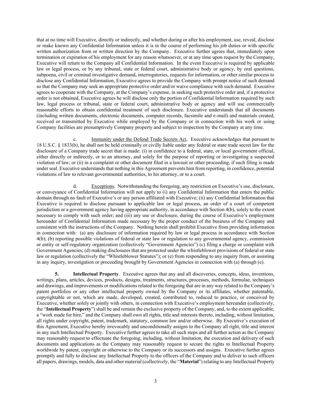 3 that at no time will Executive, directly or indirectly, and whether during or after his employment, use, reveal, disclose or make known any Confidential Information unless it is in the course of performing his job duties or with specific written authorization from or written direction by the Company. Executive further agrees that, immediately upon termination or expiration of his employment for any reason whatsoever, or at any time upon request by the Company, Executive will return to the Company all Confidential Information. In the event Executive is required by applicable law or legal process, or by any tribunal, state or federal court, administrative body or agency, by oral questions, subpoena, civil or criminal investigative demand, interrogatories, requests for information, or other similar process to disclose any Confidential Information, Executive agrees to provide the Company with prompt notice of such demand so that the Company may seek an appropriate protective order and/or waive compliance with such demand. Executive agrees to cooperate with the Company, at the Company’s expense, in seeking such protective order and, if a protective order is not obtained, Executive agrees he will disclose only the portion of Confidential Information required by such law, legal process or tribunal, state or federal court, administrative body or agency and will use commercially reasonable efforts to obtain confidential treatment of such disclosure. Executive understands that all documents (including written documents, electronic documents, computer records, facsimile and e-mail) and materials created, received or transmitted by Executive while employed by the Company or in connection with his work or using Company facilities are presumptively Company property and subject to inspection by the Company at any time. c. Immunity under the Defend Trade Secrets Act. Executive acknowledges that pursuant to 18 U.S.C. § 1833(b), he shall not be held criminally or civilly liable under any federal or state trade secret law for the disclosure of a Company trade secret that is made: (i) in confidence to a federal, state, or local government official, either directly or indirectly, or to an attorney, and solely for the purpose of reporting or investigating a suspected violation of law; or (ii) in a complaint or other document filed in a lawsuit or other proceeding, if such filing is made under seal. Executive understands that nothing in this Agreement prevents him from reporting, in confidence, potential violations of law to relevant governmental authorities, to his attorney, or to a court. d. Exceptions. Notwithstanding the foregoing, any restriction on Executive’s use, disclosure, or conveyance of Confidential Information will not apply to (i) any Confidential Information that enters the public domain through no fault of Executive’s or any person affiliated with Executive; (ii) any Confidential Information that Executive is required to disclose pursuant to applicable law or legal process, an order of a court of competent jurisdiction or a government agency having appropriate authority, in accordance with Section 4(b), solely to the extent necessary to comply with such order; and (iii) any use or disclosure, during the course of Executive’s employment hereunder of Confidential Information made necessary by the proper conduct of the business of the Company and consistent with the instructions of the Company. Nothing herein shall prohibit Executive from providing information in connection with: (a) any disclosure of information required by law or legal process in accordance with Section 4(b); (b) reporting possible violations of federal or state law or regulation to any governmental agency, commission or entity or self-regulatory organization (collectively “Government Agencies”) (c) filing a charge or complaint with Government Agencies; (d) making disclosures that are protected under the whistleblower provisions of federal or state law or regulation (collectively the “Whistleblower Statutes”); or (e) from responding to any inquiry from, or assisting in any inquiry, investigation or proceeding brought by Government Agencies in connection with (a) through (e). 5. Intellectual Property. Executive agrees that any and all discoveries, concepts, ideas, inventions, writings, plans, articles, devices, products, designs, treatments, structures, processes, methods, formulae, techniques and drawings, and improvements or modifications related to the foregoing that are in any way related to the Company’s patent portfolios or any other intellectual property owned by the Company or its affiliates, whether patentable, copyrightable or not, which are made, developed, created, contributed to, reduced to practice, or conceived by Executive, whether solely or jointly with others, in connection with Executive’s employment hereunder (collectively, the “Intellectual Property”) shall be and remain the exclusive property of the Company, and, to the extent applicable, a “work made for hire,” and the Company shall own all rights, title and interests thereto, including, without limitation, all rights under copyright, patent, trademark, statutory, common law and/or otherwise. By Executive’s execution of this Agreement, Executive hereby irrevocably and unconditionally assigns to the Company all right, title and interest in any such Intellectual Property. Executive further agrees to take all such steps and all further action as the Company may reasonably request to effectuate the foregoing, including, without limitation, the execution and delivery of such documents and applications as the Company may reasonably request to secure the rights to Intellectual Property worldwide by patent, copyright or otherwise to the Company or its successors and assigns. Executive further agrees promptly and fully to disclose any Intellectual Property to the officers of the Company and to deliver to such officers all papers, dr