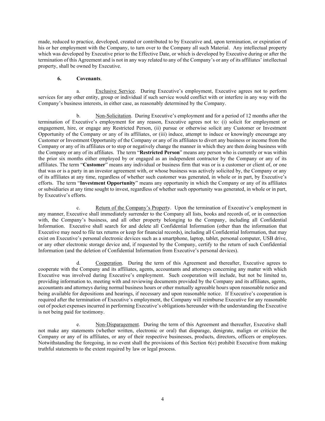 4 made, reduced to practice, developed, created or contributed to by Executive and, upon termination, or expiration of his or her employment with the Company, to turn over to the Company all such Material. Any intellectual property which was developed by Executive prior to the Effective Date, or which is developed by Executive during or after the termination of this Agreement and is not in any way related to any of the Company’s or any of its affiliates’ intellectual property, shall be owned by Executive. 6. Covenants. a. Exclusive Service. During Executive’s employment, Executive agrees not to perform services for any other entity, group or individual if such service would conflict with or interfere in any way with the Company’s business interests, in either case, as reasonably determined by the Company. b. Non-Solicitation. During Executive’s employment and for a period of 12 months after the termination of Executive’s employment for any reason, Executive agrees not to: (i) solicit for employment or engagement, hire, or engage any Restricted Person, (ii) pursue or otherwise solicit any Customer or Investment Opportunity of the Company or any of its affiliates, or (iii) induce, attempt to induce or knowingly encourage any Customer or Investment Opportunity of the Company or any of its affiliates to divert any business or income from the Company or any of its affiliates or to stop or negatively change the manner in which they are then doing business with the Company or any of its affiliates. The term “Restricted Person” means any person who is currently or was within the prior six months either employed by or engaged as an independent contractor by the Company or any of its affiliates. The term “Customer” means any individual or business firm that was or is a customer or client of, or one that was or is a party in an investor agreement with, or whose business was actively solicited by, the Company or any of its affiliates at any time, regardless of whether such customer was generated, in whole or in part, by Executive’s efforts. The term “Investment Opportunity” means any opportunity in which the Company or any of its affiliates or subsidiaries at any time sought to invest, regardless of whether such opportunity was generated, in whole or in part, by Executive’s efforts. c. Return of the Company’s Property. Upon the termination of Executive’s employment in any manner, Executive shall immediately surrender to the Company all lists, books and records of, or in connection with, the Company’s business, and all other property belonging to the Company, including all Confidential Information. Executive shall search for and delete all Confidential Information (other than the information that Executive may need to file tax returns or keep for financial records), including all Confidential Information, that may exist on Executive’s personal electronic devices such as a smartphone, laptop, tablet, personal computer, USB drive, or any other electronic storage device and, if requested by the Company, certify to the return of such Confidential Information (and the deletion of Confidential Information from Executive’s personal devices). d. Cooperation. During the term of this Agreement and thereafter, Executive agrees to cooperate with the Company and its affiliates, agents, accountants and attorneys concerning any matter with which Executive was involved during Executive’s employment. Such cooperation will include, but not be limited to, providing information to, meeting with and reviewing documents provided by the Company and its affiliates, agents, accountants and attorneys during normal business hours or other mutually agreeable hours upon reasonable notice and being available for depositions and hearings, if necessary and upon reasonable notice. If Executive’s cooperation is required after the termination of Executive’s employment, the Company will reimburse Executive for any reasonable out of pocket expenses incurred in performing Executive’s obligations hereunder with the understanding the Executive is not being paid for testimony. e. Non-Disparagement. During the term of this Agreement and thereafter, Executive shall not make any statements (whether written, electronic or oral) that disparage, denigrate, malign or criticize the Company or any of its affiliates, or any of their respective businesses, products, directors, officers or employees. Notwithstanding the foregoing, in no event shall the provisions of this Section 6(e) prohibit Executive from making truthful statements to the extent required by law or legal process.