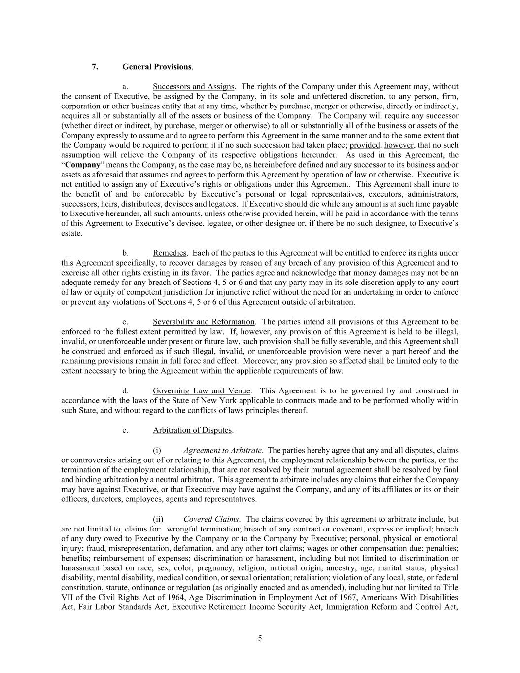 5 7. General Provisions. a. Successors and Assigns. The rights of the Company under this Agreement may, without the consent of Executive, be assigned by the Company, in its sole and unfettered discretion, to any person, firm, corporation or other business entity that at any time, whether by purchase, merger or otherwise, directly or indirectly, acquires all or substantially all of the assets or business of the Company. The Company will require any successor (whether direct or indirect, by purchase, merger or otherwise) to all or substantially all of the business or assets of the Company expressly to assume and to agree to perform this Agreement in the same manner and to the same extent that the Company would be required to perform it if no such succession had taken place; provided, however, that no such assumption will relieve the Company of its respective obligations hereunder. As used in this Agreement, the “Company” means the Company, as the case may be, as hereinbefore defined and any successor to its business and/or assets as aforesaid that assumes and agrees to perform this Agreement by operation of law or otherwise. Executive is not entitled to assign any of Executive’s rights or obligations under this Agreement. This Agreement shall inure to the benefit of and be enforceable by Executive’s personal or legal representatives, executors, administrators, successors, heirs, distributees, devisees and legatees. If Executive should die while any amount is at such time payable to Executive hereunder, all such amounts, unless otherwise provided herein, will be paid in accordance with the terms of this Agreement to Executive’s devisee, legatee, or other designee or, if there be no such designee, to Executive’s estate. b. Remedies. Each of the parties to this Agreement will be entitled to enforce its rights under this Agreement specifically, to recover damages by reason of any breach of any provision of this Agreement and to exercise all other rights existing in its favor. The parties agree and acknowledge that money damages may not be an adequate remedy for any breach of Sections 4, 5 or 6 and that any party may in its sole discretion apply to any court of law or equity of competent jurisdiction for injunctive relief without the need for an undertaking in order to enforce or prevent any violations of Sections 4, 5 or 6 of this Agreement outside of arbitration. c. Severability and Reformation. The parties intend all provisions of this Agreement to be enforced to the fullest extent permitted by law. If, however, any provision of this Agreement is held to be illegal, invalid, or unenforceable under present or future law, such provision shall be fully severable, and this Agreement shall be construed and enforced as if such illegal, invalid, or unenforceable provision were never a part hereof and the remaining provisions remain in full force and effect. Moreover, any provision so affected shall be limited only to the extent necessary to bring the Agreement within the applicable requirements of law. d. Governing Law and Venue. This Agreement is to be governed by and construed in accordance with the laws of the State of New York applicable to contracts made and to be performed wholly within such State, and without regard to the conflicts of laws principles thereof. e. Arbitration of Disputes. (i) Agreement to Arbitrate. The parties hereby agree that any and all disputes, claims or controversies arising out of or relating to this Agreement, the employment relationship between the parties, or the termination of the employment relationship, that are not resolved by their mutual agreement shall be resolved by final and binding arbitration by a neutral arbitrator. This agreement to arbitrate includes any claims that either the Company may have against Executive, or that Executive may have against the Company, and any of its affiliates or its or their officers, directors, employees, agents and representatives. (ii) Covered Claims. The claims covered by this agreement to arbitrate include, but are not limited to, claims for: wrongful termination; breach of any contract or covenant, express or implied; breach of any duty owed to Executive by the Company or to the Company by Executive; personal, physical or emotional injury; fraud, misrepresentation, defamation, and any other tort claims; wages or other compensation due; penalties; benefits; reimbursement of expenses; discrimination or harassment, including but not limited to discrimination or harassment based on race, sex, color, pregnancy, religion, national origin, ancestry, age, marital status, physical disability, mental disability, medical condition, or sexual orientation; retaliation; violation of any local, state, or federal constitution, statute, ordinance or regulation (as originally enacted and as amended), including but not limited to Title VII of the Civil Rights Act of 1964, Age Discrimination in Employment Act of 1967, Americans With Disabilities Act, Fair Labor Standards Act, Executive Retirement Income Security Act, Immigration Reform and Control Act,