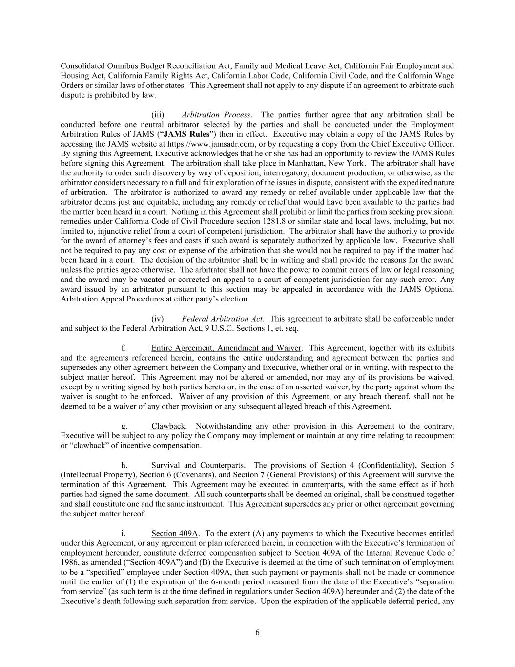 6 Consolidated Omnibus Budget Reconciliation Act, Family and Medical Leave Act, California Fair Employment and Housing Act, California Family Rights Act, California Labor Code, California Civil Code, and the California Wage Orders or similar laws of other states. This Agreement shall not apply to any dispute if an agreement to arbitrate such dispute is prohibited by law. (iii) Arbitration Process. The parties further agree that any arbitration shall be conducted before one neutral arbitrator selected by the parties and shall be conducted under the Employment Arbitration Rules of JAMS (“JAMS Rules”) then in effect. Executive may obtain a copy of the JAMS Rules by accessing the JAMS website at https://www.jamsadr.com, or by requesting a copy from the Chief Executive Officer. By signing this Agreement, Executive acknowledges that he or she has had an opportunity to review the JAMS Rules before signing this Agreement. The arbitration shall take place in Manhattan, New York. The arbitrator shall have the authority to order such discovery by way of deposition, interrogatory, document production, or otherwise, as the arbitrator considers necessary to a full and fair exploration of the issues in dispute, consistent with the expedited nature of arbitration. The arbitrator is authorized to award any remedy or relief available under applicable law that the arbitrator deems just and equitable, including any remedy or relief that would have been available to the parties had the matter been heard in a court. Nothing in this Agreement shall prohibit or limit the parties from seeking provisional remedies under California Code of Civil Procedure section 1281.8 or similar state and local laws, including, but not limited to, injunctive relief from a court of competent jurisdiction. The arbitrator shall have the authority to provide for the award of attorney’s fees and costs if such award is separately authorized by applicable law. Executive shall not be required to pay any cost or expense of the arbitration that she would not be required to pay if the matter had been heard in a court. The decision of the arbitrator shall be in writing and shall provide the reasons for the award unless the parties agree otherwise. The arbitrator shall not have the power to commit errors of law or legal reasoning and the award may be vacated or corrected on appeal to a court of competent jurisdiction for any such error. Any award issued by an arbitrator pursuant to this section may be appealed in accordance with the JAMS Optional Arbitration Appeal Procedures at either party’s election. (iv) Federal Arbitration Act. This agreement to arbitrate shall be enforceable under and subject to the Federal Arbitration Act, 9 U.S.C. Sections 1, et. seq. f. Entire Agreement, Amendment and Waiver. This Agreement, together with its exhibits and the agreements referenced herein, contains the entire understanding and agreement between the parties and supersedes any other agreement between the Company and Executive, whether oral or in writing, with respect to the subject matter hereof. This Agreement may not be altered or amended, nor may any of its provisions be waived, except by a writing signed by both parties hereto or, in the case of an asserted waiver, by the party against whom the waiver is sought to be enforced. Waiver of any provision of this Agreement, or any breach thereof, shall not be deemed to be a waiver of any other provision or any subsequent alleged breach of this Agreement. g. Clawback. Notwithstanding any other provision in this Agreement to the contrary, Executive will be subject to any policy the Company may implement or maintain at any time relating to recoupment or “clawback” of incentive compensation. h. Survival and Counterparts. The provisions of Section 4 (Confidentiality), Section 5 (Intellectual Property), Section 6 (Covenants), and Section 7 (General Provisions) of this Agreement will survive the termination of this Agreement. This Agreement may be executed in counterparts, with the same effect as if both parties had signed the same document. All such counterparts shall be deemed an original, shall be construed together and shall constitute one and the same instrument. This Agreement supersedes any prior or other agreement governing the subject matter hereof. i. Section 409A. To the extent (A) any payments to which the Executive becomes entitled under this Agreement, or any agreement or plan referenced herein, in connection with the Executive’s termination of employment hereunder, constitute deferred compensation subject to Section 409A of the Internal Revenue Code of 1986, as amended (“Section 409A”) and (B) the Executive is deemed at the time of such termination of employment to be a “specified” employee under Section 409A, then such payment or payments shall not be made or commence until the earlier of (1) the expiration of the 6-month period measured from the date of the Executive’s “separation from service” (as such term is at the time defined in regulations under Section 409A) hereunder and (2) the date of the Executive’s death following such separation from service. Upon the expiration of the applicable deferral period, any