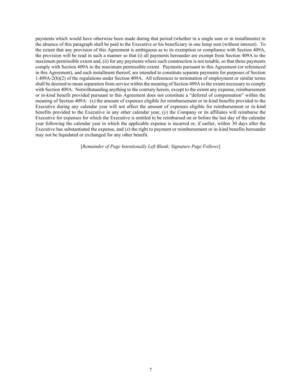 7 payments which would have otherwise been made during that period (whether in a single sum or in installments) in the absence of this paragraph shall be paid to the Executive or his beneficiary in one lump sum (without interest). To the extent that any provision of this Agreement is ambiguous as to its exemption or compliance with Section 409A, the provision will be read in such a manner so that (i) all payments hereunder are exempt from Section 409A to the maximum permissible extent and, (ii) for any payments where such construction is not tenable, so that those payments comply with Section 409A to the maximum permissible extent. Payments pursuant to this Agreement (or referenced in this Agreement), and each installment thereof, are intended to constitute separate payments for purposes of Section 1.409A-2(b)(2) of the regulations under Section 409A. All references to termination of employment or similar terms shall be deemed to mean separation from service within the meaning of Section 409A to the extent necessary to comply with Section 409A. Notwithstanding anything to the contrary herein, except to the extent any expense, reimbursement or in-kind benefit provided pursuant to this Agreement does not constitute a “deferral of compensation” within the meaning of Section 409A: (x) the amount of expenses eligible for reimbursement or in-kind benefits provided to the Executive during any calendar year will not affect the amount of expenses eligible for reimbursement or in-kind benefits provided to the Executive in any other calendar year, (y) the Company or its affiliates will reimburse the Executive for expenses for which the Executive is entitled to be reimbursed on or before the last day of the calendar year following the calendar year in which the applicable expense is incurred or, if earlier, within 30 days after the Executive has substantiated the expense, and (z) the right to payment or reimbursement or in-kind benefits hereunder may not be liquidated or exchanged for any other benefit. [Remainder of Page Intentionally Left Blank; Signature Page Follows]