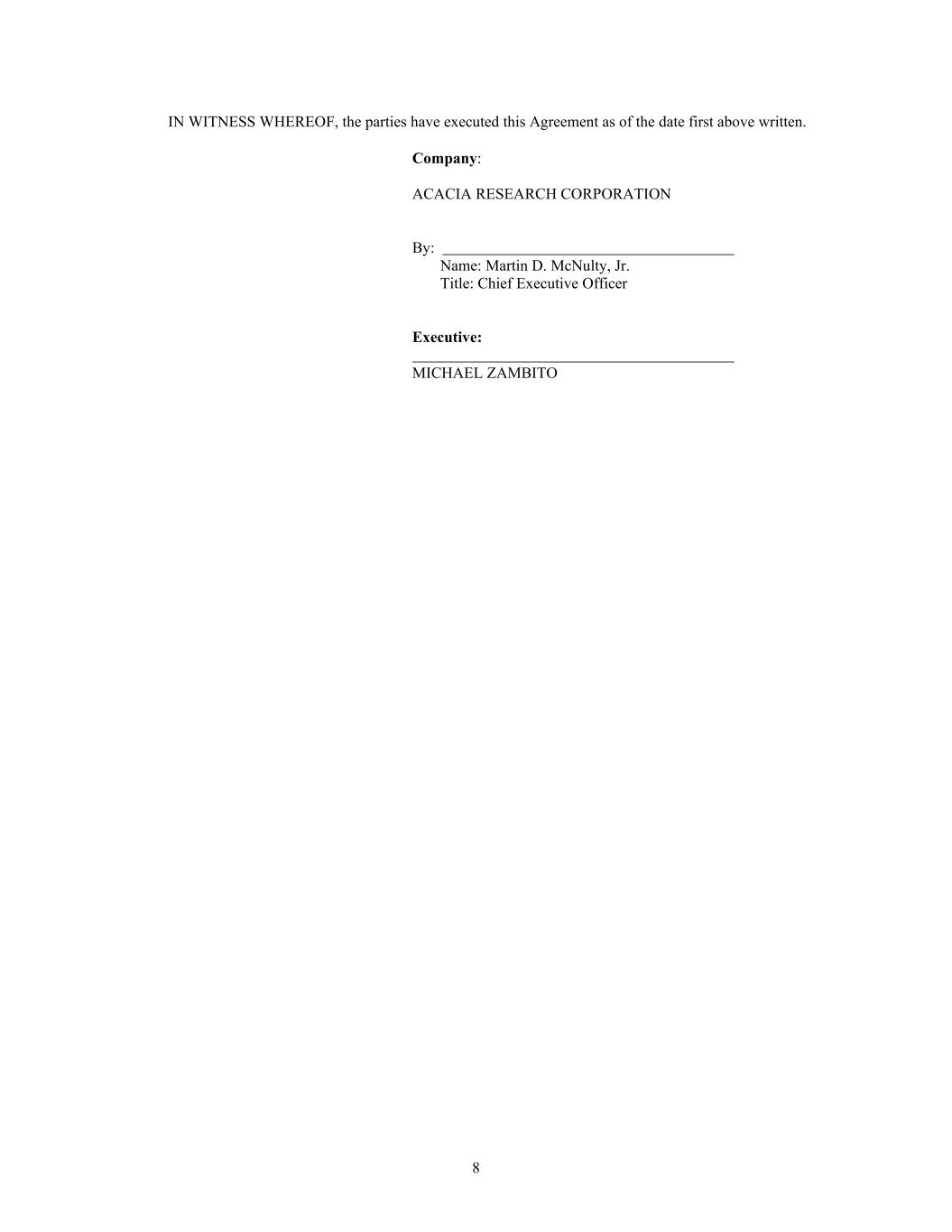 8 IN WITNESS WHEREOF, the parties have executed this Agreement as of the date first above written. Company: ACACIA RESEARCH CORPORATION By: Name: Martin D. McNulty, Jr. Title: Chief Executive Officer Executive: MICHAEL ZAMBITO