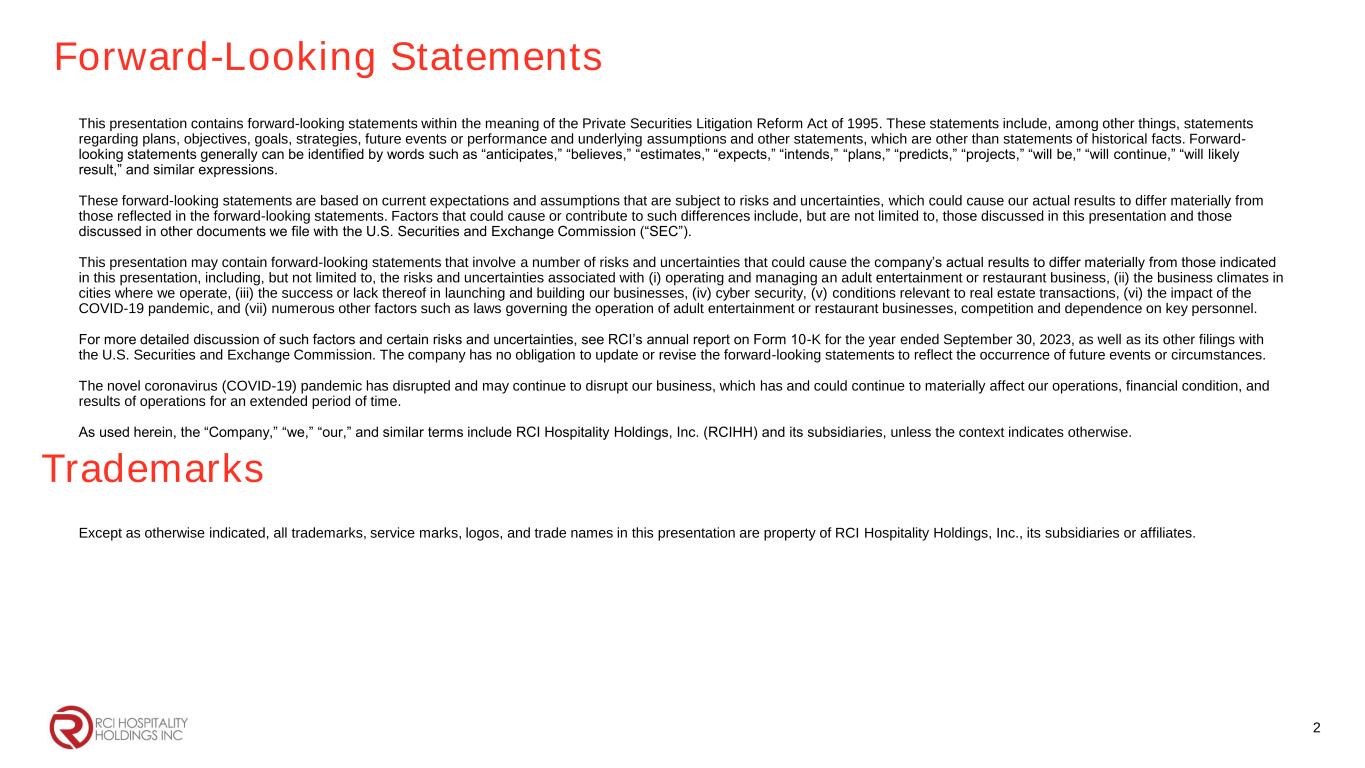 Forward-Looking Statements This presentation contains forward-looking statements within the meaning of the Private Securities Litigation Reform Act of 1995. These statements include, among other things, statements regarding plans, objectives, goals, strategies, future events or performance and underlying assumptions and other statements, which are other than statements of historical facts. Forward- looking statements generally can be identified by words such as “anticipates,” “believes,” “estimates,” “expects,” “intends,” “plans,” “predicts,” “projects,” “will be,” “will continue,” “will likely result,” and similar expressions. These forward-looking statements are based on current expectations and assumptions that are subject to risks and uncertainties, which could cause our actual results to differ materially from those reflected in the forward-looking statements. Factors that could cause or contribute to such differences include, but are not limited to, those discussed in this presentation and those discussed in other documents we file with the U.S. Securities and Exchange Commission (“SEC”). This presentation may contain forward-looking statements that involve a number of risks and uncertainties that could cause the company’s actual results to differ materially from those indicated in this presentation, including, but not limited to, the risks and uncertainties associated with (i) operating and managing an adult entertainment or restaurant business, (ii) the business climates in cities where we operate, (iii) the success or lack thereof in launching and building our businesses, (iv) cyber security, (v) conditions relevant to real estate transactions, (vi) the impact of the COVID-19 pandemic, and (vii) numerous other factors such as laws governing the operation of adult entertainment or restaurant businesses, competition and dependence on key personnel. For more detailed discussion of such factors and certain risks and uncertainties, see RCI’s annual report on Form 10-K for the year ended September 30, 2023, as well as its other filings with the U.S. Securities and Exchange Commission. The company has no obligation to update or revise the forward-looking statements to reflect the occurrence of future events or circumstances. The novel coronavirus (COVID-19) pandemic has disrupted and may continue to disrupt our business, which has and could continue to materially affect our operations, financial condition, and results of operations for an extended period of time. As used herein, the “Company,” “we,” “our,” and similar terms include RCI Hospitality Holdings, Inc. (RCIHH) and its subsidiaries, unless the context indicates otherwise. 2 Trademarks Except as otherwise indicated, all trademarks, service marks, logos, and trade names in this presentation are property of RCI Hospitality Holdings, Inc., its subsidiaries or affiliates.