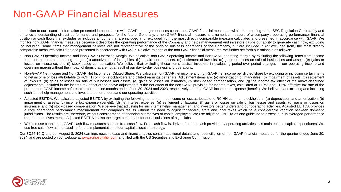 Non-GAAP Financial Measures In addition to our financial information presented in accordance with GAAP, management uses certain non-GAAP financial measures, within the meaning of the SEC Regulation G, to clarify and enhance understanding of past performance and prospects for the future. Generally, a non-GAAP financial measure is a numerical measure of a company’s operating performance, financial position or cash flows that excludes or includes amounts that are included in or excluded from the most directly comparable measure calculated and presented in accordance with GAAP. We monitor non-GAAP financial measures because it describes the operating performance of the Company and helps management and investors gauge our ability to generate cash flow, excluding (or including) some items that management believes are not representative of the ongoing business operations of the Company, but are included in (or excluded from) the most directly comparable measures calculated and presented in accordance with GAAP. Relative to each of the non-GAAP financial measures, we further set forth our rationale as follows: • Non-GAAP Operating Income and Non-GAAP Operating Margin. We calculate non-GAAP operating income and non-GAAP operating margin by excluding the following items from income from operations and operating margin: (a) amortization of intangibles, (b) impairment of assets, (c) settlement of lawsuits, (d) gains or losses on sale of businesses and assets, (e) gains or losses on insurance, and (f) stock-based compensation. We believe that excluding these items assists investors in evaluating period-over-period changes in our operating income and operating margin without the impact of items that are not a result of our day-to-day business and operations. • Non-GAAP Net Income and Non-GAAP Net Income per Diluted Share. We calculate non-GAAP net income and non-GAAP net income per diluted share by excluding or including certain items to net income or loss attributable to RCIHH common stockholders and diluted earnings per share. Adjustment items are: (a) amortization of intangibles, (b) impairment of assets, (c) settlement of lawsuits, (d) gains or losses on sale of businesses and assets, (e) gains or losses on insurance, (f) stock-based compensation, and (g) the income tax effect of the above-described adjustments. Included in the income tax effect of the above adjustments is the net effect of the non-GAAP provision for income taxes, calculated at 11.7% and 21.6% effective tax rate of the pre-tax non-GAAP income before taxes for the nine months ended June 30, 2024 and 2023, respectively, and the GAAP income tax expense (benefit). We believe that excluding and including such items help management and investors better understand our operating activities. • Adjusted EBITDA. We calculate adjusted EBITDA by excluding the following items from net income or loss attributable to RCIHH common stockholders: (a) depreciation and amortization, (b) impairment of assets, (c) income tax expense (benefit), (d) net interest expense, (e) settlement of lawsuits, (f) gains or losses on sale of businesses and assets, (g) gains or losses on insurance, and (h) stock-based compensation. We believe that adjusting for such items helps management and investors better understand our operating activities. Adjusted EBITDA provides a core operational performance measurement that compares results without the need to adjust for federal, state and local taxes which have considerable variation between domestic jurisdictions. The results are, therefore, without consideration of financing alternatives of capital employed. We use adjusted EBITDA as one guideline to assess our unleveraged performance return on our investments. Adjusted EBITDA is also the target benchmark for our acquisitions of nightclubs. • We also use certain non-GAAP cash flow measures such as free cash flow. Free cash flow is derived from net cash provided by operating activities less maintenance capital expenditures. We use free cash flow as the baseline for the implementation of our capital allocation strategy. Our 3Q24 10-Q and our August 8, 2024 earnings news release and financial tables contain additional details and reconciliation of non-GAAP financial measures for the quarter ended June 30, 2024, and are posted on our website at www.rcihospitality.com and filed with the US Securities and Exchange Commission. 3