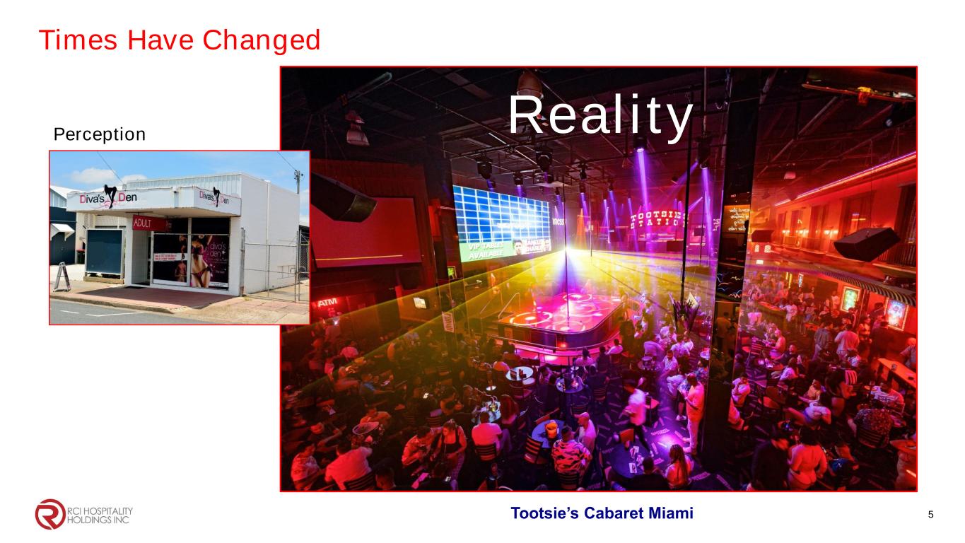 Adult Nightclubs Compelling Investment Opportunity Only public company that owns & acquires adult nightclubs Classic, timeless & legal segment of adult entertainment Consistent & predictable cash flows High barriers to entry & limited competition Fragmented market with significant acquisition opportunities 4 Strong Business Model