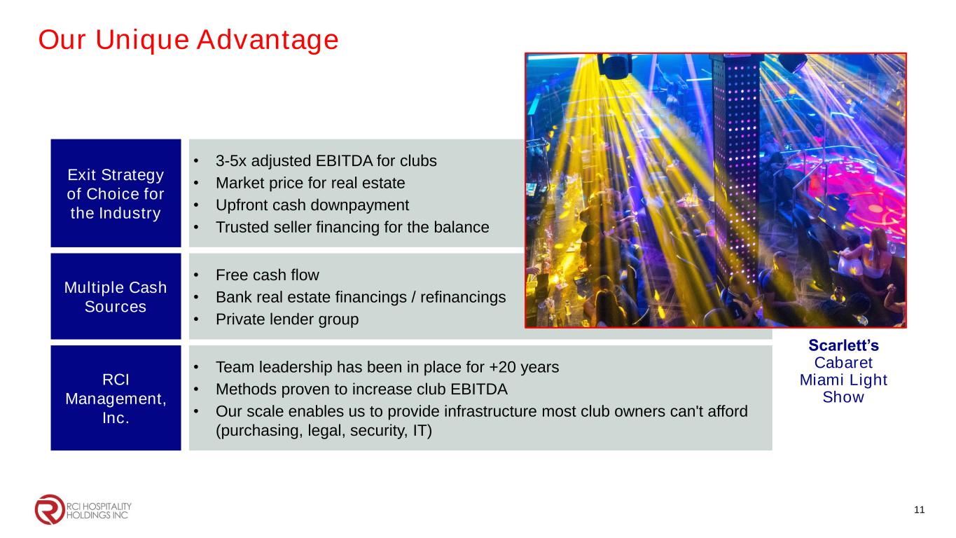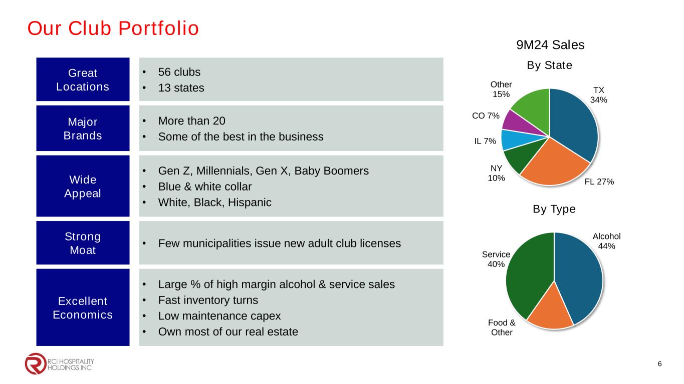Our Club Portfolio 6 Great Locations • 56 clubs • 13 states Major Brands • More than 20 • Some of the best in the business Wide Appeal • Gen Z, Millennials, Gen X, Baby Boomers • Blue & white collar • White, Black, Hispanic Strong Moat • Few municipalities issue new adult club licenses Excellent Economics • Large % of high margin alcohol & service sales • Fast inventory turns • Low maintenance capex • Own most of our real estate TX 34% FL 27% NY 10% IL 7% CO 7% Other 15% By State 9M24 Sales Alcohol 44% Food & Other Service 40% By Type