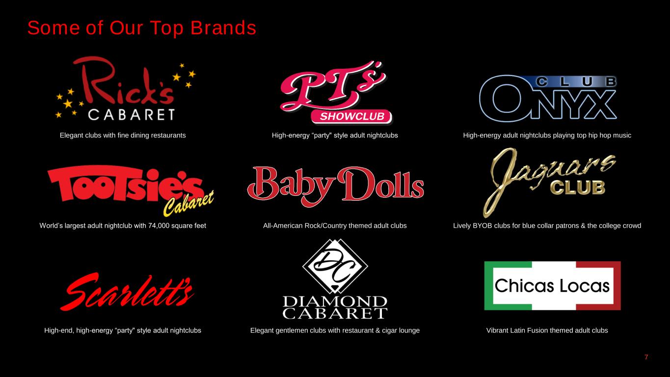 Some of Our Top Brands 7 Elegant clubs with fine dining restaurants High-energy “party" style adult nightclubs High-energy adult nightclubs playing top hip hop music World’s largest adult nightclub with 74,000 square feet All-American Rock/Country themed adult clubs Lively BYOB clubs for blue collar patrons & the college crowd High-end, high-energy “party" style adult nightclubs Elegant gentlemen clubs with restaurant & cigar lounge Vibrant Latin Fusion themed adult clubs