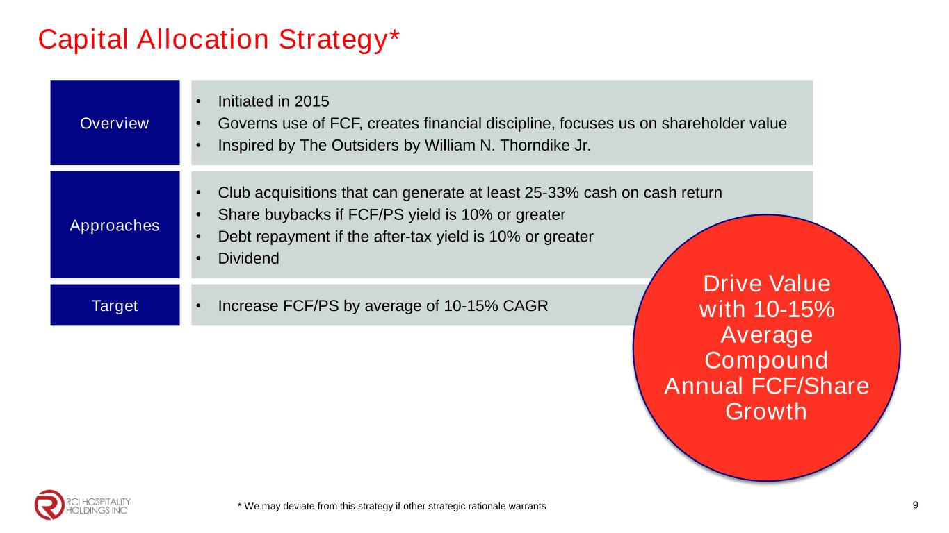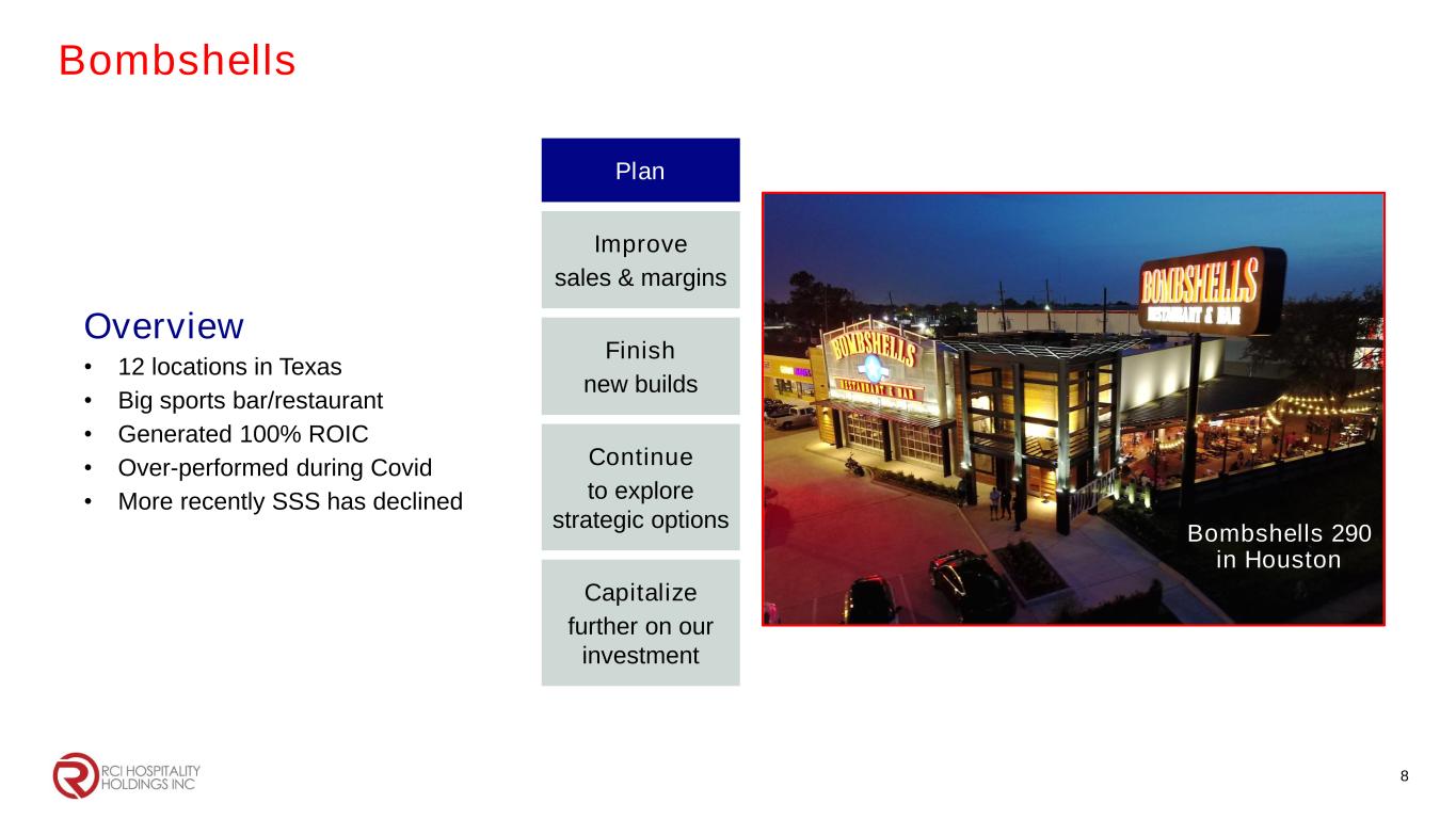 Bombshells 8 Plan Improve sales & margins Finish new builds Continue to explore strategic options Capitalize further on our investment Bombshells 290 in Houston Overview • 12 locations in Texas • Big sports bar/restaurant • Generated 100% ROIC • Over-performed during Covid • More recently SSS has declined Bombshells 290 in Houston