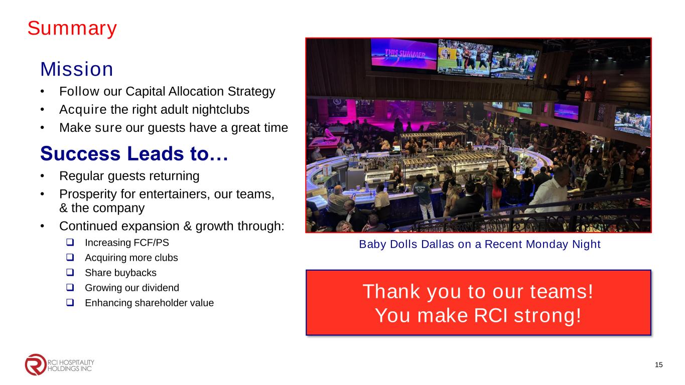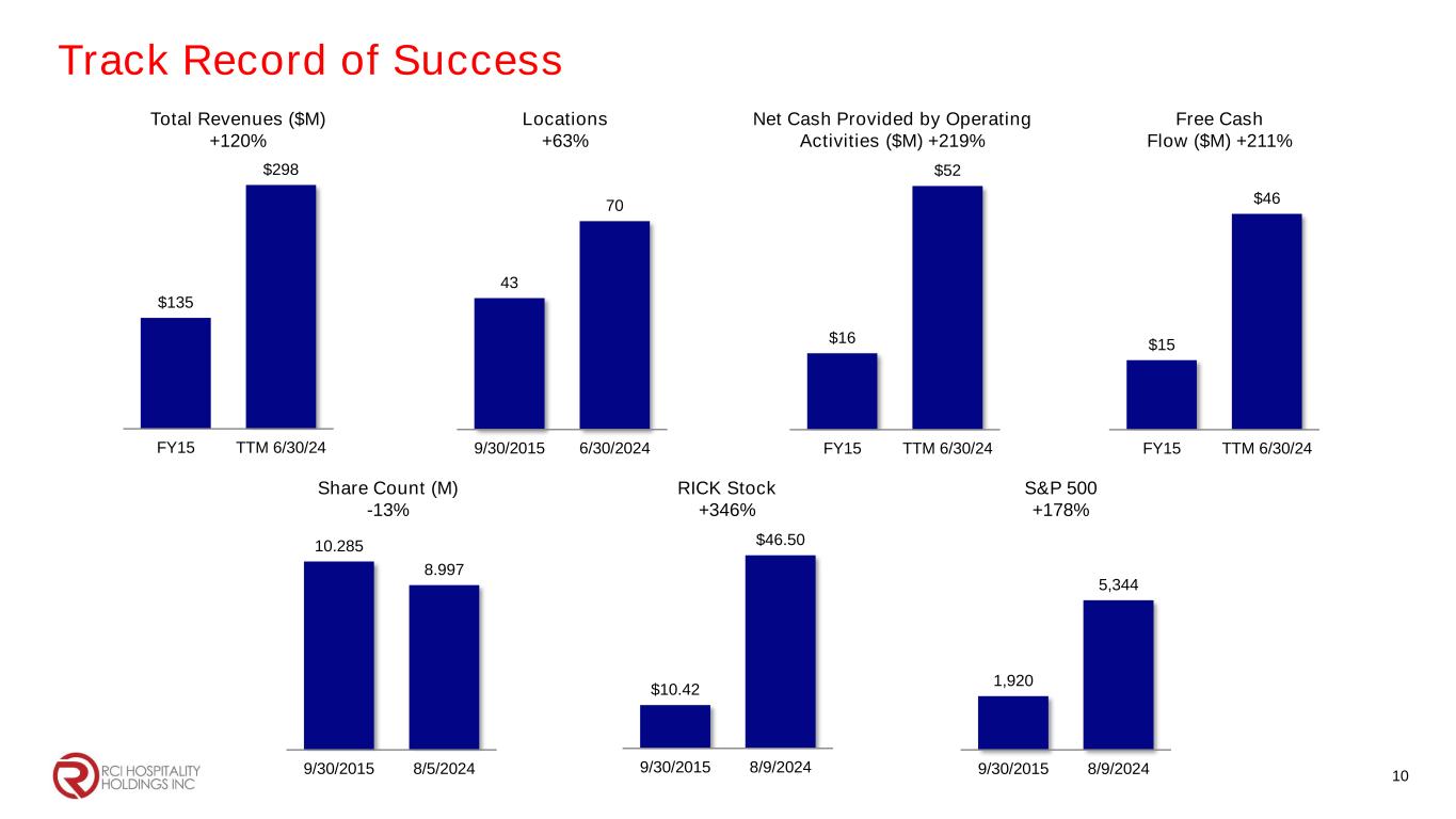 Track Record of Success $135 $298 FY15 TTM 6/30/24 43 70 9/30/2015 6/30/2024 $16 $52 FY15 TTM 6/30/24 $15 $46 FY15 TTM 6/30/24 10.285 8.997 9/30/2015 8/5/2024 $10.42 $46.50 9/30/2015 8/9/2024 1,920 5,344 9/30/2015 8/9/2024 Total Revenues ($M) +120% Locations +63% Net Cash Provided by Operating Activities ($M) +219% Free Cash Flow ($M) +211% Share Count (M) -13% RICK Stock +346% S&P 500 +178% 10