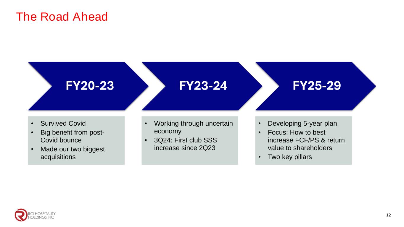 Our Unique Advantage 11 Exit Strategy of Choice for the Industry • 3-5x adjusted EBITDA for clubs • Market price for real estate • Upfront cash downpayment • Trusted seller financing for the balance Multiple Cash Sources • Free cash flow • Bank real estate financings / refinancings • Private lender group RCI Management, Inc. • Team leadership has been in place for +20 years • Methods proven to increase club EBITDA • Our scale enables us to provide infrastructure most club owners can't afford (purchasing, legal, security, IT) Scarlett’s Cabaret Miami Light Show