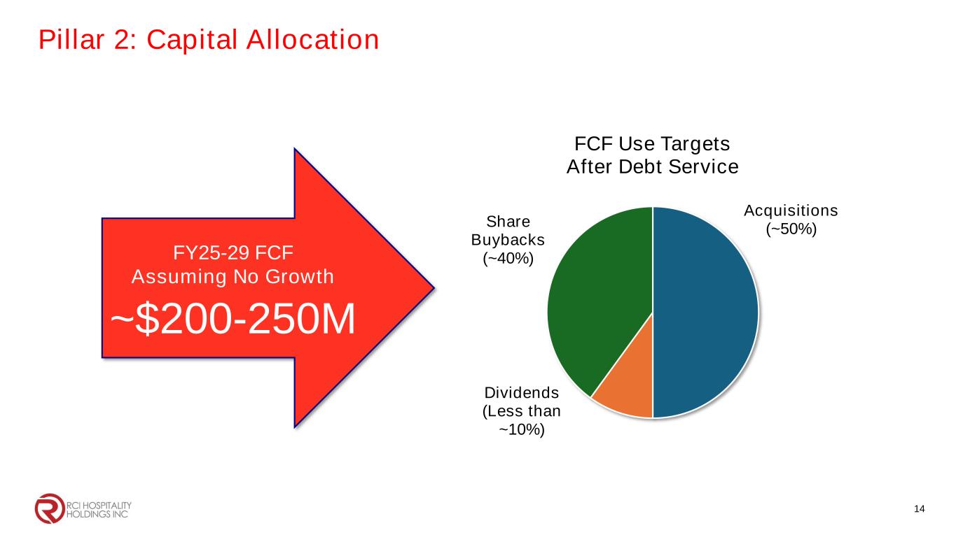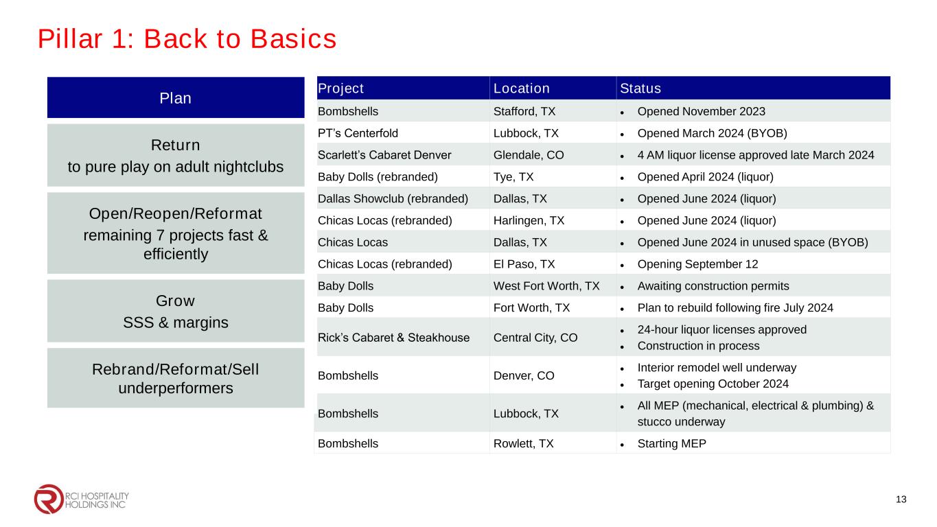 Pillar 1: Back to Basics 13 Project Location Status Bombshells Stafford, TX • Opened November 2023 PT’s Centerfold Lubbock, TX • Opened March 2024 (BYOB) Scarlett’s Cabaret Denver Glendale, CO • 4 AM liquor license approved late March 2024 Baby Dolls (rebranded) Tye, TX • Opened April 2024 (liquor) Dallas Showclub (rebranded) Dallas, TX • Opened June 2024 (liquor) Chicas Locas (rebranded) Harlingen, TX • Opened June 2024 (liquor) Chicas Locas Dallas, TX • Opened June 2024 in unused space (BYOB) Chicas Locas (rebranded) El Paso, TX • Opening September 12 Baby Dolls West Fort Worth, TX • Awaiting construction permits Baby Dolls Fort Worth, TX • Plan to rebuild following fire July 2024 Rick’s Cabaret & Steakhouse Central City, CO • 24-hour liquor licenses approved • Construction in process Bombshells Denver, CO • Interior remodel well underway • Target opening October 2024 Bombshells Lubbock, TX • All MEP (mechanical, electrical & plumbing) & stucco underway Bombshells Rowlett, TX • Starting MEP Plan Return to pure play on adult nightclubs Open/Reopen/Reformat remaining 7 projects fast & efficiently Grow SSS & margins Rebrand/Reformat/Sell underperformers