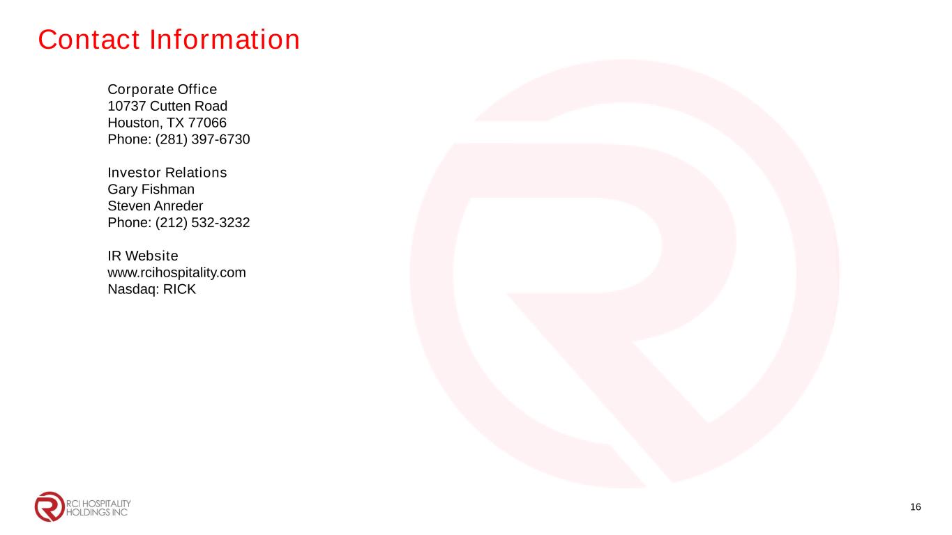 Corporate Office 10737 Cutten Road Houston, TX 77066 Phone: (281) 397-6730 Investor Relations Gary Fishman Steven Anreder Phone: (212) 532-3232 IR Website www.rcihospitality.com Nasdaq: RICK Contact Information 16