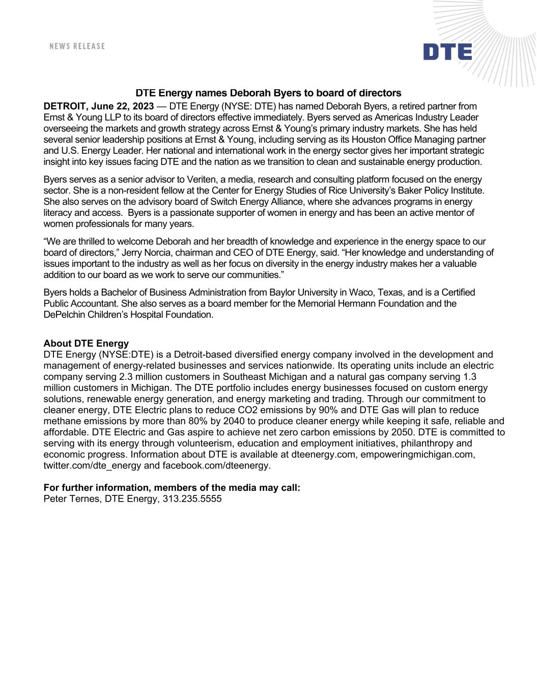 DTE Energy names Deborah Byers to board of directors DETROIT, June 22, 2023 — DTE Energy (NYSE: DTE) has named Deborah Byers, a retired partner from Ernst & Young LLP to its board of directors effective immediately. Byers served as Americas Industry Leader overseeing the markets and growth strategy across Ernst & Young’s primary industry markets. She has held several senior leadership positions at Ernst & Young, including serving as its Houston Office Managing partner and U.S. Energy Leader. Her national and international work in the energy sector gives her important strategic insight into key issues facing DTE and the nation as we transition to clean and sustainable energy production. Byers serves as a senior advisor to Veriten, a media, research and consulting platform focused on the energy sector. She is a non-resident fellow at the Center for Energy Studies of Rice University’s Baker Policy Institute. She also serves on the advisory board of Switch Energy Alliance, where she advances programs in energy literacy and access. Byers is a passionate supporter of women in energy and has been an active mentor of women professionals for many years. “We are thrilled to welcome Deborah and her breadth of knowledge and experience in the energy space to our board of directors,” Jerry Norcia, chairman and CEO of DTE Energy, said. “Her knowledge and understanding of issues important to the industry as well as her focus on diversity in the energy industry makes her a valuable addition to our board as we work to serve our communities.” Byers holds a Bachelor of Business Administration from Baylor University in Waco, Texas, and is a Certified Public Accountant. She also serves as a board member for the Memorial Hermann Foundation and the DePelchin Children’s Hospital Foundation. About DTE Energy DTE Energy (NYSE:DTE) is a Detroit-based diversified energy company involved in the development and management of energy-related businesses and services nationwide. Its operating units include an electric company serving 2.3 million customers in Southeast Michigan and a natural gas company serving 1.3 million customers in Michigan. The DTE portfolio includes energy businesses focused on custom energy solutions, renewable energy generation, and energy marketing and trading. Through our commitment to cleaner energy, DTE Electric plans to reduce CO2 emissions by 90% and DTE Gas will plan to reduce methane emissions by more than 80% by 2040 to produce cleaner energy while keeping it safe, reliable and affordable. DTE Electric and Gas aspire to achieve net zero carbon emissions by 2050. DTE is committed to serving with its energy through volunteerism, education and employment initiatives, philanthropy and economic progress. Information about DTE is available at dteenergy.com, empoweringmichigan.com, twitter.com/dte_energy and facebook.com/dteenergy. For further information, members of the media may call: Peter Ternes, DTE Energy, 313.235.5555