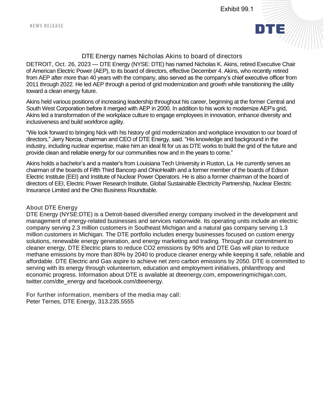 DTE Energy names Nicholas Akins to board of directors DETROIT, Oct. 26, 2023 — DTE Energy (NYSE: DTE) has named Nicholas K. Akins, retired Executive Chair of American Electric Power (AEP), to its board of directors, effective December 4. Akins, who recently retired from AEP after more than 40 years with the company, also served as the company’s chief executive officer from 2011 through 2022. He led AEP through a period of grid modernization and growth while transitioning the utility toward a clean energy future. Akins held various positions of increasing leadership throughout his career, beginning at the former Central and South West Corporation before it merged with AEP in 2000. In addition to his work to modernize AEP’s grid, Akins led a transformation of the workplace culture to engage employees in innovation, enhance diversity and inclusiveness and build workforce agility. “We look forward to bringing Nick with his history of grid modernization and workplace innovation to our board of directors,” Jerry Norcia, chairman and CEO of DTE Energy, said. “His knowledge and background in the industry, including nuclear expertise, make him an ideal fit for us as DTE works to build the grid of the future and provide clean and reliable energy for our communities now and in the years to come.” Akins holds a bachelor’s and a master’s from Louisiana Tech University in Ruston, La. He currently serves as chairman of the boards of Fifth Third Bancorp and OhioHealth and a former member of the boards of Edison Electric Institute (EEI) and Institute of Nuclear Power Operators. He is also a former chairman of the board of directors of EEI, Electric Power Research Institute, Global Sustainable Electricity Partnership, Nuclear Electric Insurance Limited and the Ohio Business Roundtable. About DTE Energy DTE Energy (NYSE:DTE) is a Detroit-based diversified energy company involved in the development and management of energy-related businesses and services nationwide. Its operating units include an electric company serving 2.3 million customers in Southeast Michigan and a natural gas company serving 1.3 million customers in Michigan. The DTE portfolio includes energy businesses focused on custom energy solutions, renewable energy generation, and energy marketing and trading. Through our commitment to cleaner energy, DTE Electric plans to reduce CO2 emissions by 90% and DTE Gas will plan to reduce methane emissions by more than 80% by 2040 to produce cleaner energy while keeping it safe, reliable and affordable. DTE Electric and Gas aspire to achieve net zero carbon emissions by 2050. DTE is committed to serving with its energy through volunteerism, education and employment initiatives, philanthropy and economic progress. Information about DTE is available at dteenergy.com, empoweringmichigan.com, twitter.com/dte_energy and facebook.com/dteenergy. For further information, members of the media may call: Peter Ternes, DTE Energy, 313.235.5555 Exhibit 99.1