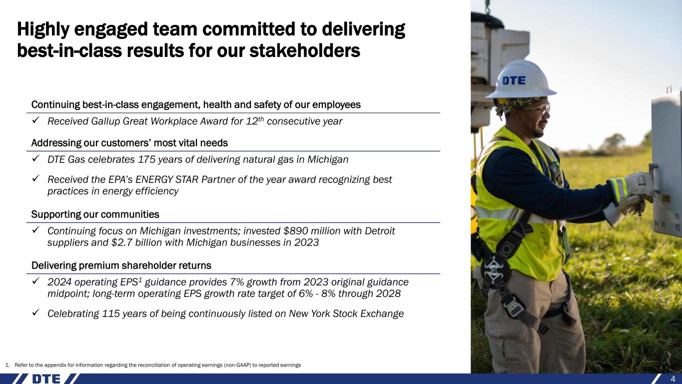 Safe harbor statement 2 The information contained herein is as of the date of this document. DTE Energy expressly disclaims any current intention to update any forward-looking statements contained in this document as a result of new information or future events or developments. Words such as “anticipate,” “believe,” “expect,” “may,” “could,” “projected,” “aspiration,” “plans” and “goals” signify forward-looking statements. Forward-looking statements are not guarantees of future results and conditions but rather are subject to various assumptions, risks and uncertainties that may cause actual future results to be materially different from those contemplated, projected, estimated or budgeted. Many factors may impact forward-looking statements including, but not limited to, the following: the impact of regulation by the EPA, EGLE, the FERC, the MPSC, the NRC, and for DTE Energy, the CFTC and CARB, as well as other applicable governmental proceedings and regulations, including any associated impact on rate structures; the amount and timing of cost recovery allowed as a result of regulatory proceedings, related appeals, or new legislation, including legislative amendments and retail access programs; economic conditions and population changes in our geographic area resulting in changes in demand, customer conservation, and thefts of electricity and, for DTE Energy, natural gas; the operational failure of electric or gas distribution systems or infrastructure; impact of volatility in prices in international steel markets and in prices of environmental attributes generated from renewable natural gas investments on the operations of DTE Vantage; the risk of a major safety incident; environmental issues, laws, regulations, and the increasing costs of remediation and compliance, including actual and potential new federal and state requirements; the cost of protecting assets and customer data against, or damage due to, cyber incidents and terrorism; health, safety, financial, environmental, and regulatory risks associated with ownership and operation of nuclear facilities; volatility in commodity markets, deviations in weather and related risks impacting the results of DTE Energy’s energy trading operations; changes in the cost and availability of coal and other raw materials, purchased power, and natural gas; advances in technology that produce power, store power or reduce power consumption; changes in the financial condition of significant customers and strategic partners; the potential for losses on investments, including nuclear decommissioning trust and benefit plan assets and the related increases in future expense and contributions; access to capital markets and the results of other financing efforts which can be affected by credit agency ratings; instability in capital markets which could impact availability of short and long-term financing; impacts of inflation and the timing and extent of changes in interest rates; the level of borrowings; the potential for increased costs or delays in completion of significant capital projects; changes in, and application of, federal, state, and local tax laws and their interpretations, including the Internal Revenue Code, regulations, rulings, court proceedings, and audits; the effects of weather and other natural phenomena, including climate change, on operations and sales to customers, and purchases from suppliers; unplanned outages at our generation plants; employee relations and the impact of collective bargaining agreements; the availability, cost, coverage, and terms of insurance and stability of insurance providers; cost reduction efforts and the maximization of plant and distribution system performance; the effects of competition; changes in and application of accounting standards and financial reporting regulations; changes in federal or state laws and their interpretation with respect to regulation, energy policy, and other business issues; successful execution of new business development and future growth plans; contract disputes, binding arbitration, litigation, and related appeals; the ability of the electric and gas utilities to achieve net zero emissions goals; and the risks discussed in DTE Energy’s public filings with the Securities and Exchange Commission. New factors emerge from time to time. We cannot predict what factors may arise or how such factors may cause results to differ materially from those contained in any forward-looking statement. Any forward-looking statements speak only as of the date on which such statements are made. We undertake no obligation to update any forward-looking statement to reflect events or circumstances after the date on which such statement is made or to reflect the occurrence of unanticipated events. This document should also be read in conjunction with the Forward-Looking Statements section in DTE Energy’s public filings with the Securities and Exchange Commission.