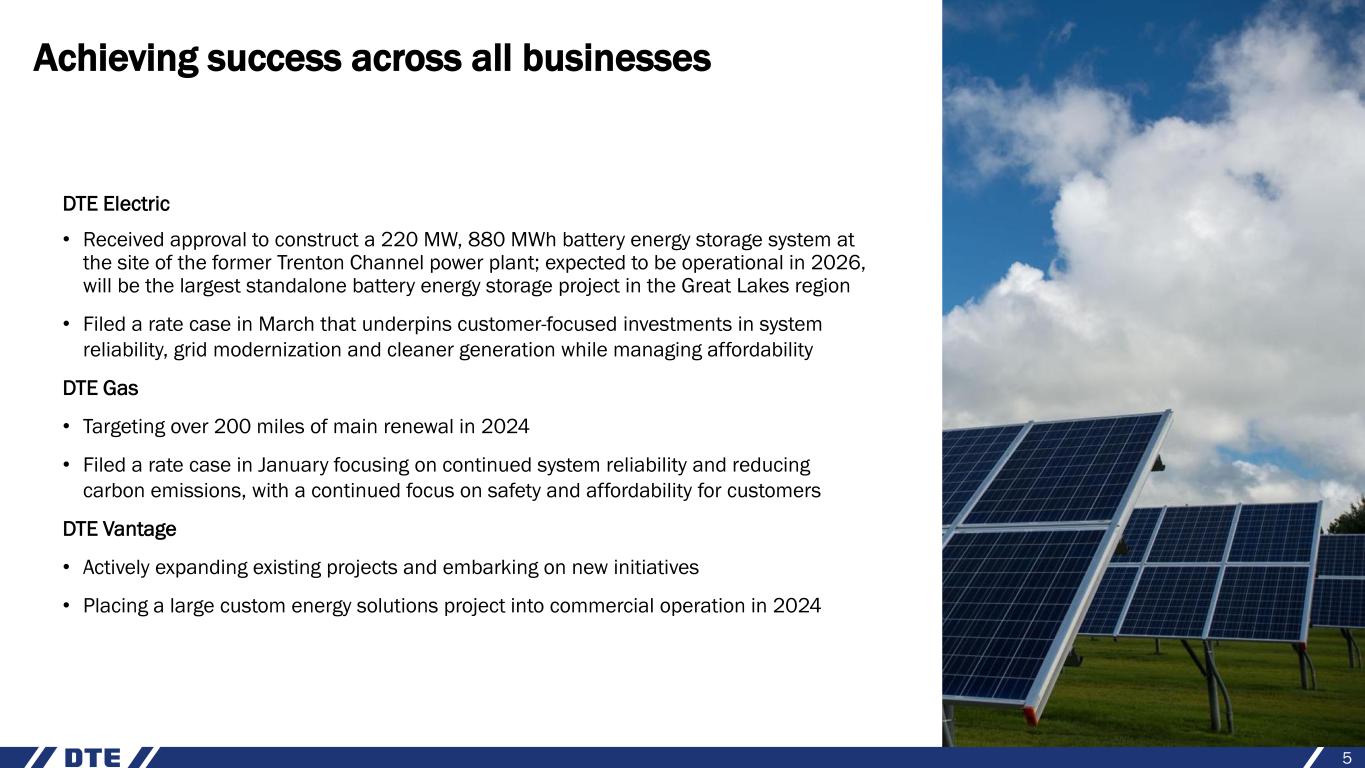 4 Continuing best-in-class engagement, health and safety of our employees ✓ Received Gallup Great Workplace Award for 12th consecutive year Addressing our customers’ most vital needs ✓ DTE Gas celebrates 175 years of delivering natural gas in Michigan ✓ Received the EPA’s ENERGY STAR Partner of the year award recognizing best practices in energy efficiency Supporting our communities ✓ Continuing focus on Michigan investments; invested $890 million with Detroit suppliers and $2.7 billion with Michigan businesses in 2023 Delivering premium shareholder returns ✓ 2024 operating EPS1 guidance provides 7% growth from 2023 original guidance midpoint; long-term operating EPS growth rate target of 6% - 8% through 2028 ✓ Celebrating 115 years of being continuously listed on New York Stock Exchange Highly engaged team committed to delivering best-in-class results for our stakeholders 1. Refer to the appendix for information regarding the reconciliation of operating earnings (non-GAAP) to reported earnings
