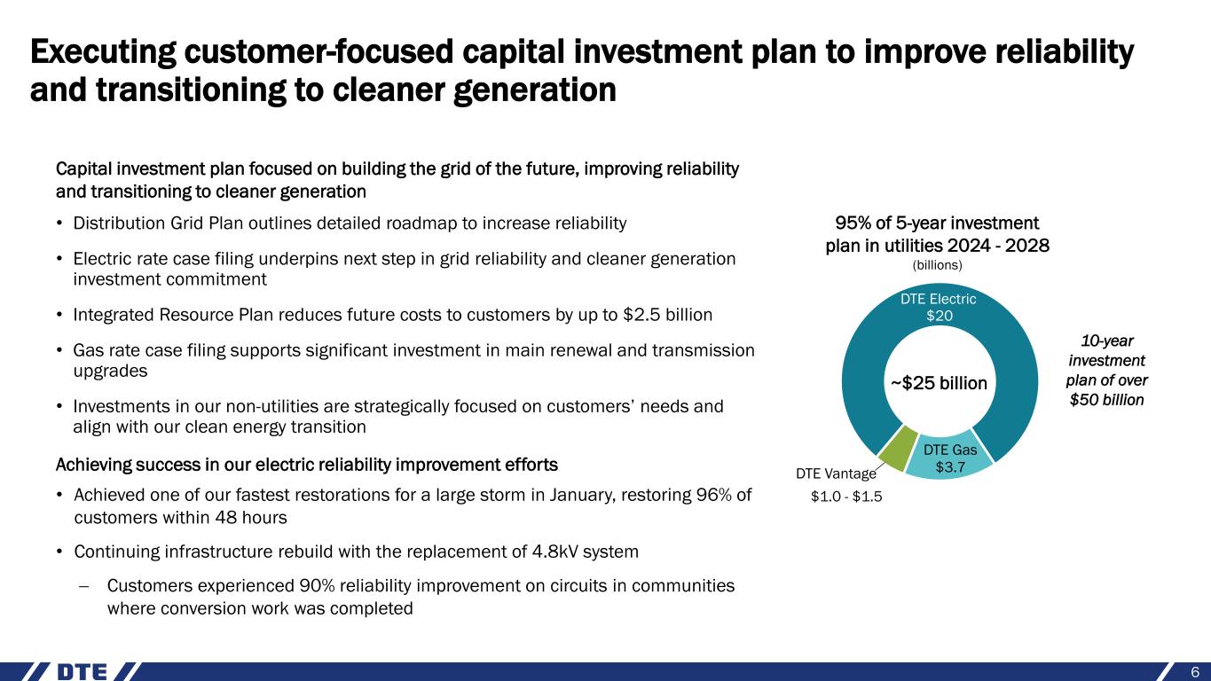 Achieving success across all businesses 5 DTE Electric • Received approval to construct a 220 MW, 880 MWh battery energy storage system at the site of the former Trenton Channel power plant; expected to be operational in 2026, will be the largest standalone battery energy storage project in the Great Lakes region • Filed a rate case in March that underpins customer-focused investments in system reliability, grid modernization and cleaner generation while managing affordability DTE Gas • Targeting over 200 miles of main renewal in 2024 • Filed a rate case in January focusing on continued system reliability and reducing carbon emissions, with a continued focus on safety and affordability for customers DTE Vantage • Actively expanding existing projects and embarking on new initiatives • Placing a large custom energy solutions project into commercial operation in 2024