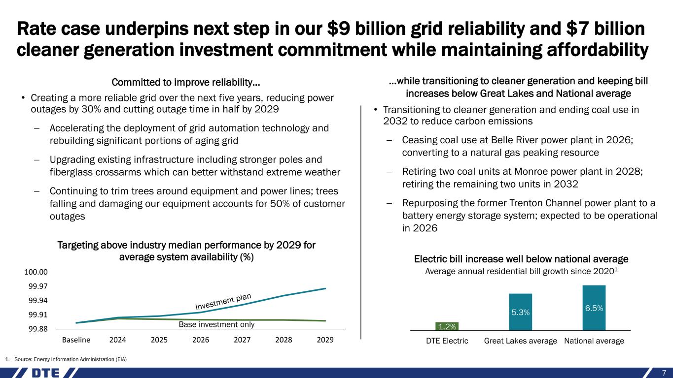6 Executing customer-focused capital investment plan to improve reliability and transitioning to cleaner generation ~$25 billion DTE Electric DTE Gas DTE Vantage $20 $3.7 $1.0 - $1.5 95% of 5-year investment plan in utilities 2024 - 2028 (billions) 10-year investment plan of over $50 billion Capital investment plan focused on building the grid of the future, improving reliability and transitioning to cleaner generation • Distribution Grid Plan outlines detailed roadmap to increase reliability • Electric rate case filing underpins next step in grid reliability and cleaner generation investment commitment • Integrated Resource Plan reduces future costs to customers by up to $2.5 billion • Gas rate case filing supports significant investment in main renewal and transmission upgrades • Investments in our non-utilities are strategically focused on customers’ needs and align with our clean energy transition Achieving success in our electric reliability improvement efforts • Achieved one of our fastest restorations for a large storm in January, restoring 96% of customers within 48 hours • Continuing infrastructure rebuild with the replacement of 4.8kV system − Customers experienced 90% reliability improvement on circuits in communities where conversion work was completed
