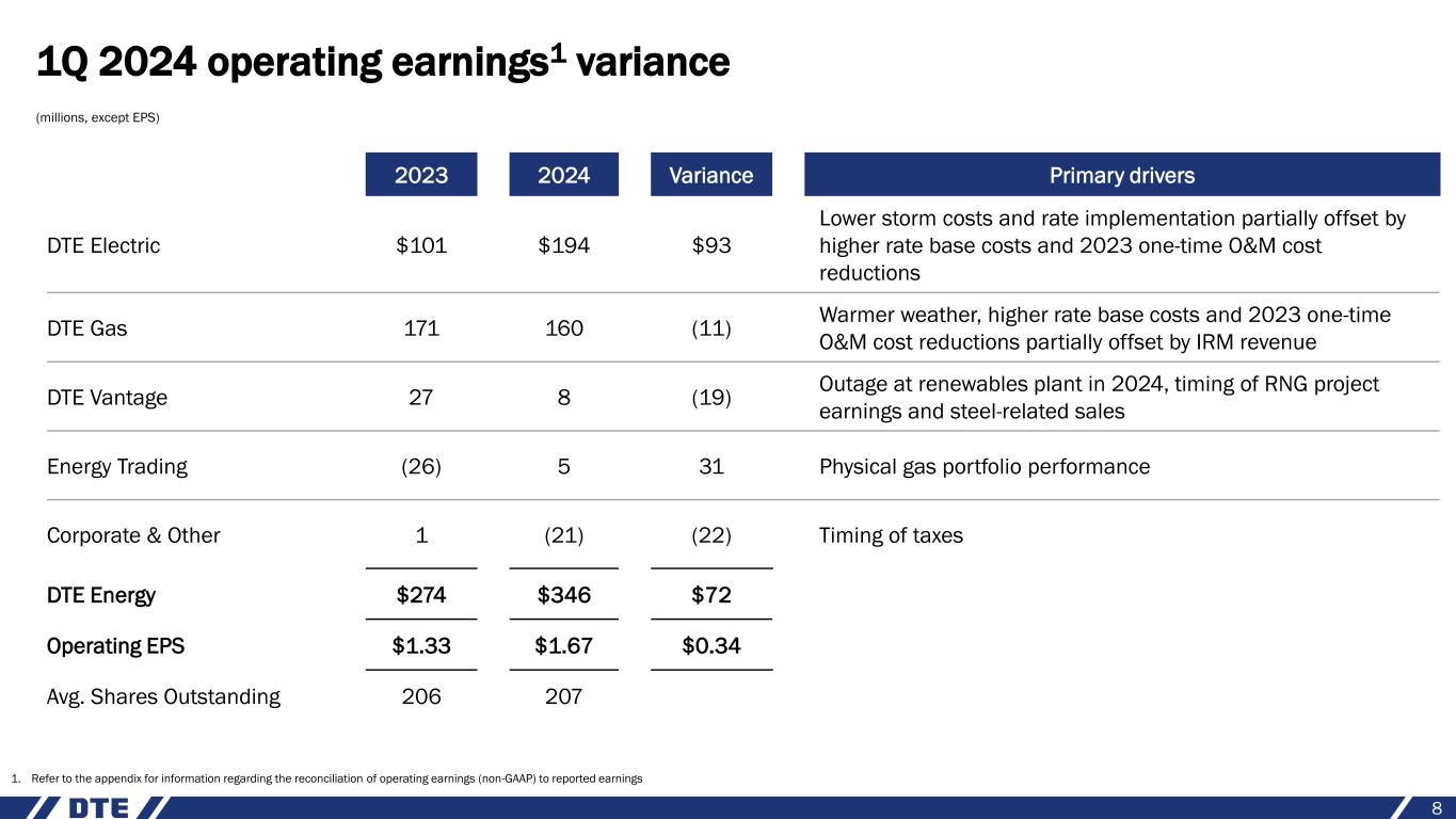 Reconciliation of reported to operating earnings (non-GAAP) 17 Use of Operating Earnings Information – Operating earnings exclude non-recurring items, certain mark-to-market adjustments and discontinued operations. DTE Energy management believes that operating earnings provide a meaningful representation of the company’s earnings from ongoing operations and uses operating earnings as the primary performance measurement for external communications with analysts and investors. Internally, DTE Energy uses operating earnings to measure performance against budget and to report to the Board of Directors. Operating earnings is a non-GAAP measure and should be viewed as a supplement and not a substitute for reported earnings, which represents the company’s net income and the most comparable GAAP measure. In this presentation, DTE Energy provides guidance for future period operating earnings. It is likely that certain items that impact the company’s future period reported results will be excluded from operating results. A reconciliation to the comparable future period reported earnings is not provided because it is not possible to provide a reliable forecast of specific line items (i.e., future non-recurring items, certain mark-to-market adjustments and discontinued operations). These items may fluctuate significantly from period to period and may have a significant impact on reported earnings. Definition of net zero Goal for DTE Energy's utility operations and gas suppliers at DTE Gas that any carbon emissions put into the atmosphere will be balanced by those taken out of the atmosphere. Achieving this goal will include collective efforts to reduce carbon emissions and actions to offset any remaining emissions. Progress towards net zero goals is estimated and methodologies and calculations may vary from those of other utility businesses with similar targets. Carbon emissions is defined as emissions of carbon containing compounds, including carbon dioxide and methane, that are identified as greenhouse gases.