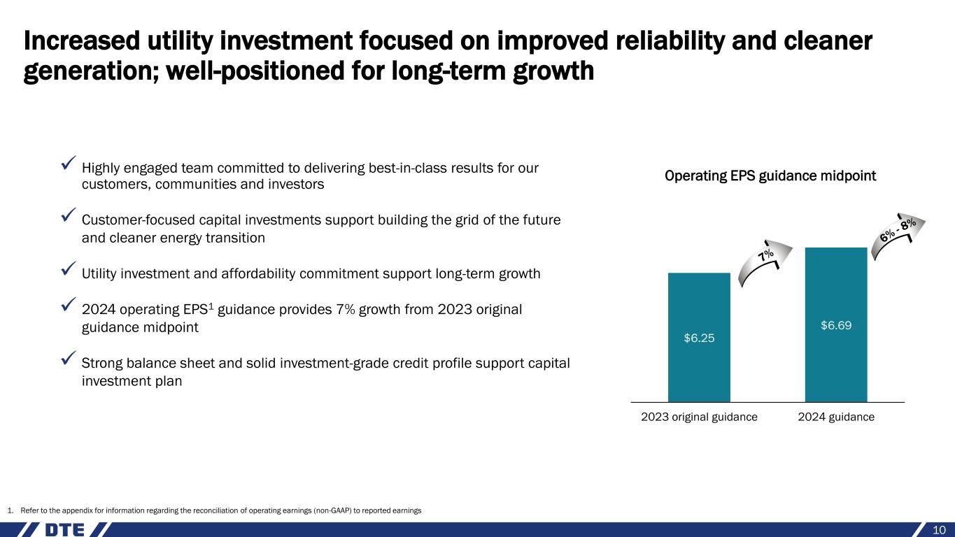 Maintaining strong cash flows, balance sheet and credit profile 9 Credit ratings S&P Moody’s Fitch DTE Energy (unsecured) BBB Baa2 BBB DTE Electric (secured) A Aa3 A+ DTE Gas (secured) A A1 A Strong balance sheet supports robust customer-focused investment agenda • Customer-focused capital investment plan is supported by consistent, healthy cash flows • Targeting minimal equity issuances of $0 - $100 million annually through 2026 • Effectively managing near-term debt maturities to support long-term plan • Maintaining solid investment-grade credit ratings; targeting 15% - 16% FFO / Debt1 1. Funds from Operations (FFO) is calculated using operating earnings, debt excludes a portion of DTE Gas’ short-term debt and considers 50% of the junior subordinated notes as equity