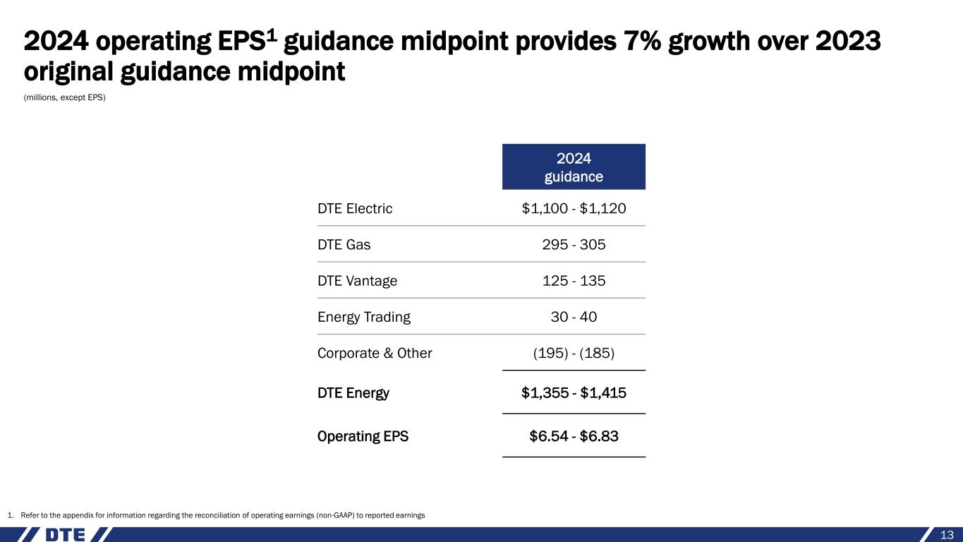 Weather impact on sales 12 1. DTE Electric 2023 weather normalized data based on 2007 – 2021 weather and 2024 weather normalized data based on 2008 – 2022 weather 2. Refer to the appendix for information regarding the reconciliation of operating earnings (non-GAAP) to reported earnings 3. DTE Gas 2023 weather normalized data based on 2008 – 2022 weather and 2024 weather normalized data based on 2009 – 2023 weather Cooling degree days1 Operating earnings2 impact of weather Weather normal sales1 DTE Electric Heating degree days3 Operating earnings2 impact of weather DTE Gas (GWh) 1Q 2023 1Q 2024 % Change Residential 3,611 3,661 1.4% Commercial 4,569 4,624 1.2% Industrial 2,537 2,541 0.2% Other 56 54 (3.6%) 10,773 10,880 1.0% 1Q 2023 1Q 2024 % Change Actuals - - 0% Normal - - 0% Deviation from normal 0% 0% 1Q 2023 1Q 2024 % Change Actuals 2,822 2,743 (3%) Normal 3,235 3,236 0% Deviation from normal (13%) (15%) Millions Per share 1Q 1Q 2023 ($29) ($0.14) 2024 ($33) ($0.16) Millions Per share 1Q 1Q 2023 ($20) ($0.10) 2024 ($25) ($0.12)