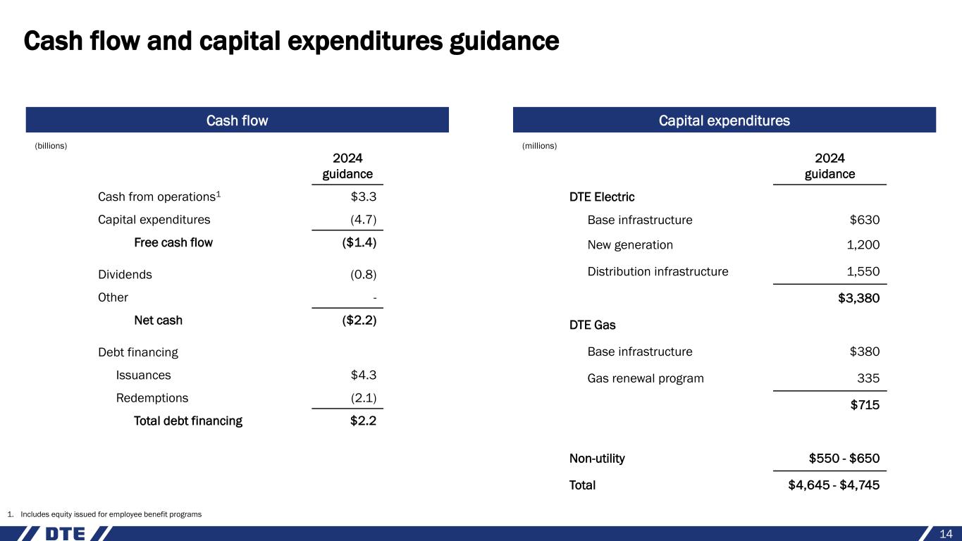 2024 operating EPS1 guidance midpoint provides 7% growth over 2023 original guidance midpoint 13 (millions, except EPS) 2024 guidance DTE Electric $1,100 - $1,120 DTE Gas 295 - 305 DTE Vantage 125 - 135 Energy Trading 30 - 40 Corporate & Other (195) - (185) DTE Energy $1,355 - $1,415 Operating EPS $6.54 - $6.83 1. Refer to the appendix for information regarding the reconciliation of operating earnings (non-GAAP) to reported earnings