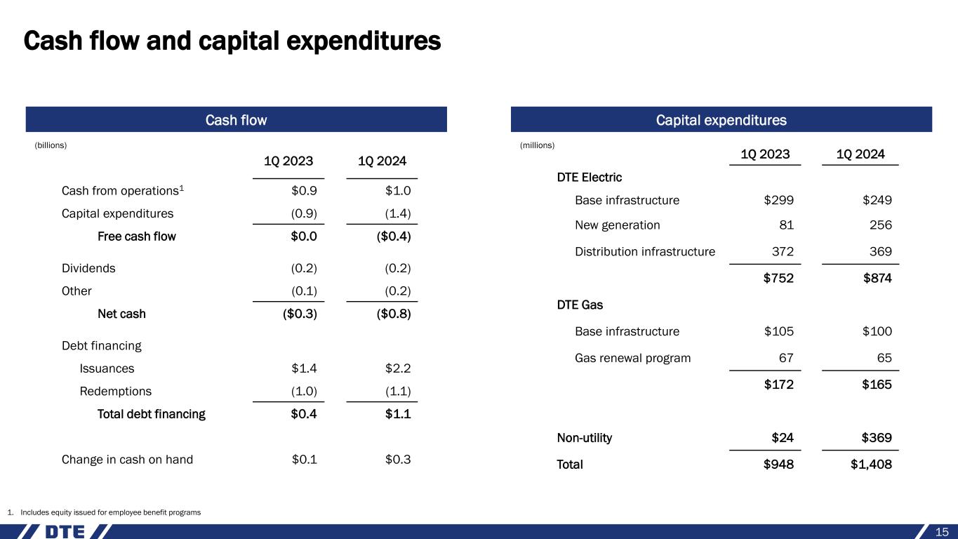 2024 guidance DTE Electric Base infrastructure $630 New generation 1,200 Distribution infrastructure 1,550 $3,380 DTE Gas Base infrastructure $380 Gas renewal program 335 $715 Non-utility $550 - $650 Total $4,645 - $4,745 2024 guidance Cash from operations1 $3.3 Capital expenditures (4.7) Free cash flow ($1.4) Dividends (0.8) Other - Net cash ($2.2) Debt financing Issuances $4.3 Redemptions (2.1) Total debt financing $2.2 Cash flow and capital expenditures guidance 14 (millions) Cash flow Capital expenditures (billions) 1. Includes equity issued for employee benefit programs