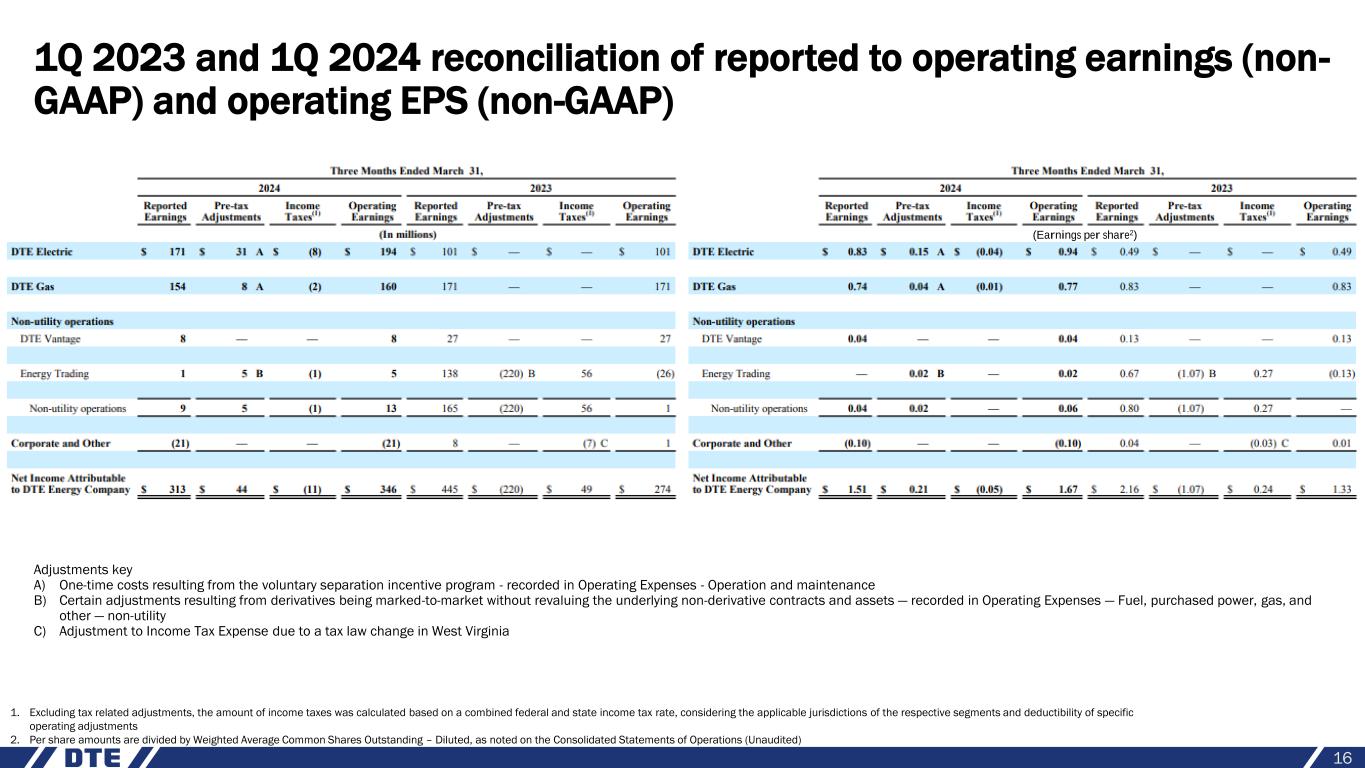 1Q 2023 1Q 2024 DTE Electric Base infrastructure $299 $249 New generation 81 256 Distribution infrastructure 372 369 $752 $874 DTE Gas Base infrastructure $105 $100 Gas renewal program 67 65 $172 $165 Non-utility $24 $369 Total $948 $1,408 1Q 2023 1Q 2024 Cash from operations1 $0.9 $1.0 Capital expenditures (0.9) (1.4) Free cash flow $0.0 ($0.4) Dividends (0.2) (0.2) Other (0.1) (0.2) Net cash ($0.3) ($0.8) Debt financing Issuances $1.4 $2.2 Redemptions (1.0) (1.1) Total debt financing $0.4 $1.1 Change in cash on hand $0.1 $0.3 Cash flow and capital expenditures 15 (millions) Cash flow Capital expenditures (billions) 1. Includes equity issued for employee benefit programs