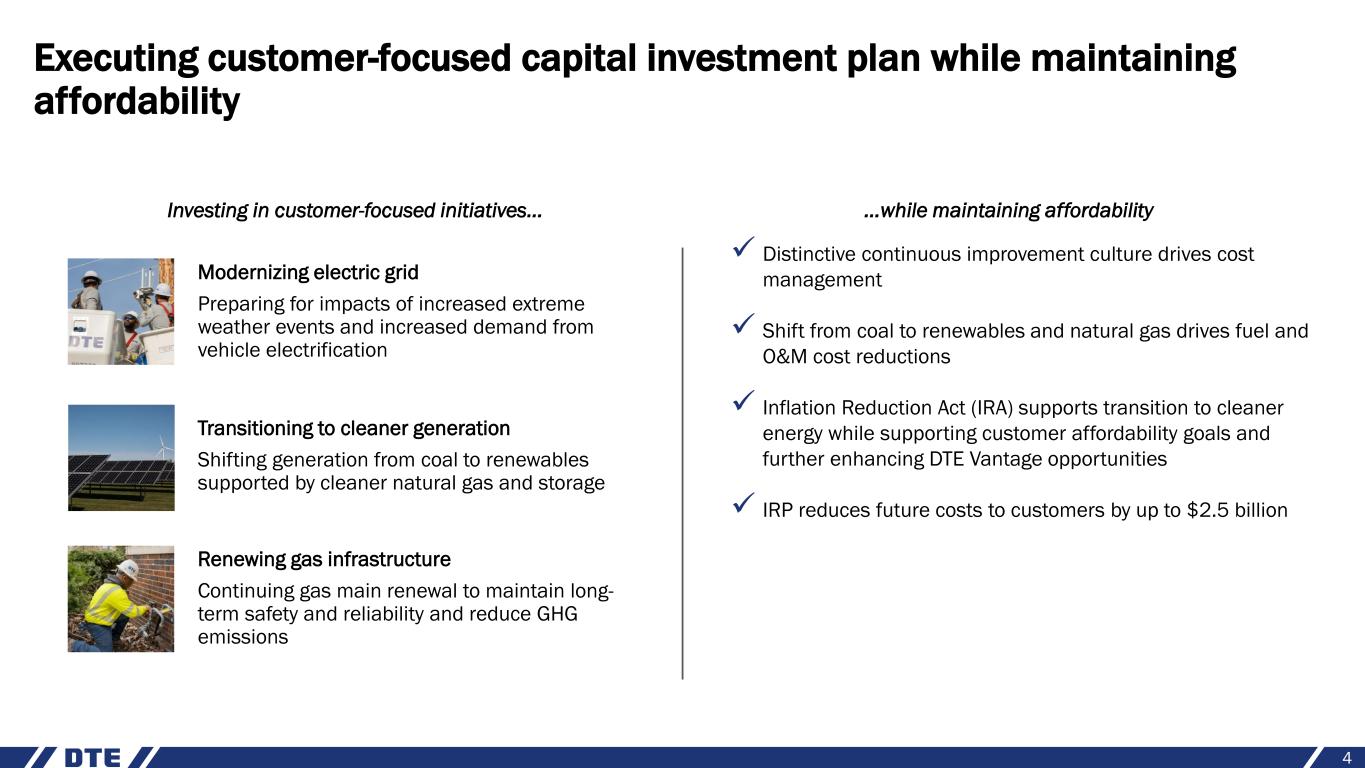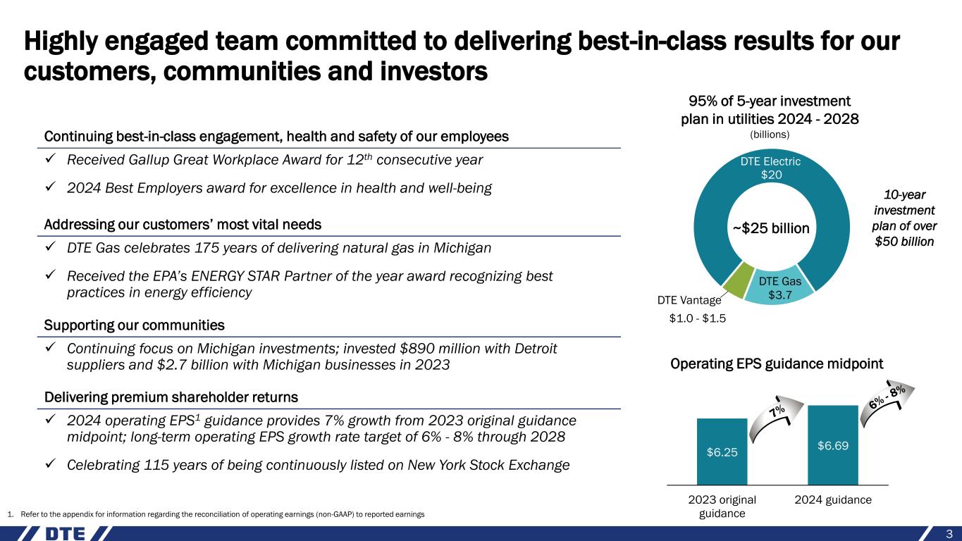 Safe harbor statement 2 The information contained herein is as of the date of this document. DTE Energy expressly disclaims any current intention to update any forward-looking statements contained in this document as a result of new information or future events or developments. Words such as “anticipate,” “believe,” “expect,” “may,” “could,” “projected,” “aspiration,” “plans” and “goals” signify forward-looking statements. Forward-looking statements are not guarantees of future results and conditions but rather are subject to various assumptions, risks and uncertainties that may cause actual future results to be materially different from those contemplated, projected, estimated or budgeted. Many factors may impact forward-looking statements including, but not limited to, the following: the impact of regulation by the EPA, EGLE, the FERC, the MPSC, the NRC, and for DTE Energy, the CFTC and CARB, as well as other applicable governmental proceedings and regulations, including any associated impact on rate structures; the amount and timing of cost recovery allowed as a result of regulatory proceedings, related appeals, or new legislation, including legislative amendments and retail access programs; economic conditions and population changes in our geographic area resulting in changes in demand, customer conservation, and thefts of electricity and, for DTE Energy, natural gas; the operational failure of electric or gas distribution systems or infrastructure; impact of volatility in prices in international steel markets and in prices of environmental attributes generated from renewable natural gas investments on the operations of DTE Vantage; the risk of a major safety incident; environmental issues, laws, regulations, and the increasing costs of remediation and compliance, including actual and potential new federal and state requirements; the cost of protecting assets and customer data against, or damage due to, cyber incidents and terrorism; health, safety, financial, environmental, and regulatory risks associated with ownership and operation of nuclear facilities; volatility in commodity markets, deviations in weather and related risks impacting the results of DTE Energy’s energy trading operations; changes in the cost and availability of coal and other raw materials, purchased power, and natural gas; advances in technology that produce power, store power or reduce power consumption; changes in the financial condition of significant customers and strategic partners; the potential for losses on investments, including nuclear decommissioning trust and benefit plan assets and the related increases in future expense and contributions; access to capital markets and the results of other financing efforts which can be affected by credit agency ratings; instability in capital markets which could impact availability of short and long-term financing; impacts of inflation and the timing and extent of changes in interest rates; the level of borrowings; the potential for increased costs or delays in completion of significant capital projects; changes in, and application of, federal, state, and local tax laws and their interpretations, including the Internal Revenue Code, regulations, rulings, court proceedings, and audits; the effects of weather and other natural phenomena, including climate change, on operations and sales to customers, and purchases from suppliers; unplanned outages at our generation plants; employee relations and the impact of collective bargaining agreements; the availability, cost, coverage, and terms of insurance and stability of insurance providers; cost reduction efforts and the maximization of plant and distribution system performance; the effects of competition; changes in and application of accounting standards and financial reporting regulations; changes in federal or state laws and their interpretation with respect to regulation, energy policy, and other business issues; successful execution of new business development and future growth plans; contract disputes, binding arbitration, litigation, and related appeals; the ability of the electric and gas utilities to achieve net zero emissions goals; and the risks discussed in DTE Energy’s public filings with the Securities and Exchange Commission. New factors emerge from time to time. We cannot predict what factors may arise or how such factors may cause results to differ materially from those contained in any forward-looking statement. Any forward-looking statements speak only as of the date on which such statements are made. We undertake no obligation to update any forward-looking statement to reflect events or circumstances after the date on which such statement is made or to reflect the occurrence of unanticipated events. This document should also be read in conjunction with the Forward-Looking Statements section in DTE Energy’s public filings with the Securities and Exchange Commission.