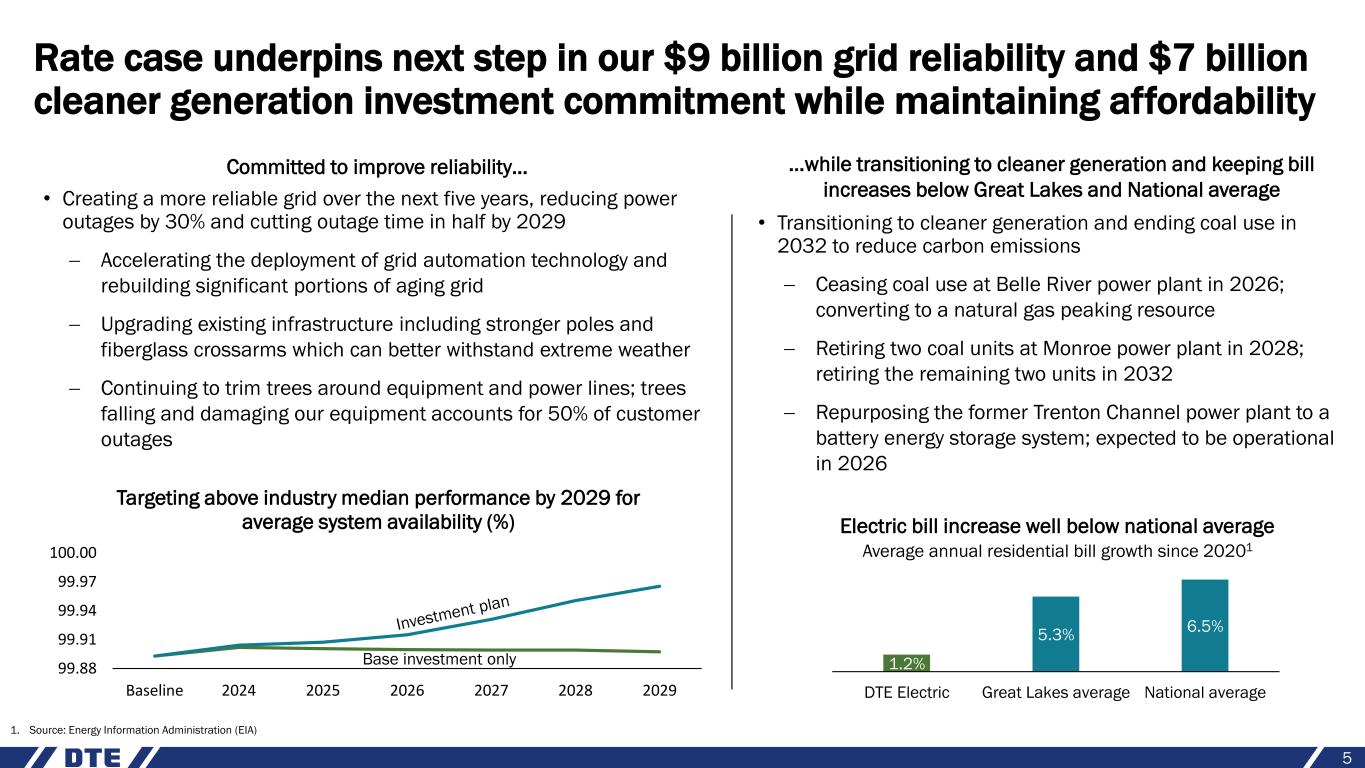 Modernizing electric grid Preparing for impacts of increased extreme weather events and increased demand from vehicle electrification Transitioning to cleaner generation Shifting generation from coal to renewables supported by cleaner natural gas and storage Executing customer-focused capital investment plan while maintaining affordability 4 Investing in customer-focused initiatives… …while maintaining affordability ✓ Distinctive continuous improvement culture drives cost management ✓ Shift from coal to renewables and natural gas drives fuel and O&M cost reductions ✓ Inflation Reduction Act (IRA) supports transition to cleaner energy while supporting customer affordability goals and further enhancing DTE Vantage opportunities ✓ IRP reduces future costs to customers by up to $2.5 billion Renewing gas infrastructure Continuing gas main renewal to maintain long- term safety and reliability and reduce GHG emissions
