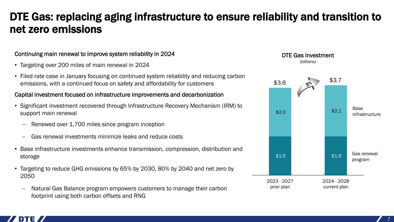 DTE Electric: transformational investments in distribution and generation 6 $4 $4 $9 $9 $5 $7 2023 - 2027 prior plan 2024 - 2028 current plan Base infrastructure Cleaner generation $18 DTE Electric investment (billions) $20 Distribution infrastructure 1. Definition of net zero included in the appendix Achieving success in cleaner generation and reliability in 2024 • Received approval to construct a 220 MW, 880 MWh battery energy storage system at the site of the former Trenton Channel power plant; expected to be operational in 2026, will be the largest standalone battery energy storage project in the Great Lakes region • Filed rate case in March that underpins customer-focused investments in system reliability, grid modernization and cleaner generation while managing affordability • Achieved one of our fastest restorations for a large storm in January, restoring 96% of customers within 48 hours • Continuing infrastructure rebuild with the replacement of 4.8kV system; customers experienced 90% reliability improvement on circuits in communities where conversion work was completed Capital investment plan focused on building the grid of the future and transitioning to cleaner generation • Transforming generation by targeting carbon emission reductions of 85% in 2032, 90% by 2040 and net zero1 by 2050 − Cleaner generation investment driven by expanded renewables and utility-scale energy storage; provides more affordable energy for customers over the long term − Renewable investment supports continued success of MIGreenPower voluntary program