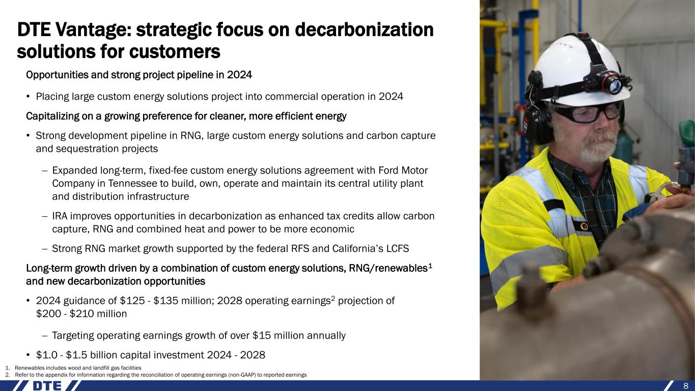 DTE Gas: replacing aging infrastructure to ensure reliability and transition to net zero emissions 7 Gas renewal program Base infrastructure $1.6 $1.6 $2.0 $2.1 2023 - 2027 prior plan 2024 - 2028 current plan $3.6 $3.7 DTE Gas investment (billions) Continuing main renewal to improve system reliability in 2024 • Targeting over 200 miles of main renewal in 2024 • Filed rate case in January focusing on continued system reliability and reducing carbon emissions, with a continued focus on safety and affordability for customers Capital investment focused on infrastructure improvements and decarbonization • Significant investment recovered through Infrastructure Recovery Mechanism (IRM) to support main renewal − Renewed over 1,700 miles since program inception − Gas renewal investments minimize leaks and reduce costs • Base infrastructure investments enhance transmission, compression, distribution and storage • Targeting to reduce GHG emissions by 65% by 2030, 80% by 2040 and net zero by 2050 − Natural Gas Balance program empowers customers to manage their carbon footprint using both carbon offsets and RNG