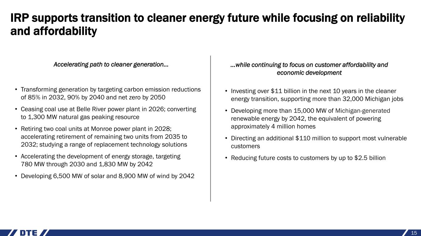 IRP outlines accelerated path to cleaner energy 77% 31% 15% 17% 19% 20% 18% 12% 2% 24% 27% 34% 20% 3% 4% 6% 6% 6% 1% 22% 32% 42% 62% 2005 2027 2029 2033 2042 Coal Nuclear Natural gas RenewablesStorage Generation mix1 (MWh %) First 5 years (2023 - 2027) • Ceasing coal use at one Belle River unit in 2025 and remaining unit in 2026; converting to 1,300 MW natural gas peaking resource • Adding 1,200 MW of solar • Adding 350 MW of energy storage, increased from 240 MW Second 5 years (2028 - 2032) • Retiring two coal units at Monroe in 2028 and accelerating retirement of two remaining units to 2032 from 2035 • Adding 3,200 MW of solar • Adding 1,000 MW of wind • Adding 430 MW of energy storage Next 10 years (2033 - 2042) • Adding 2,100 MW of solar • Adding 7,900 MW of wind • Adding 1,050 MW of energy storage 14 1. Generation mix subject to change