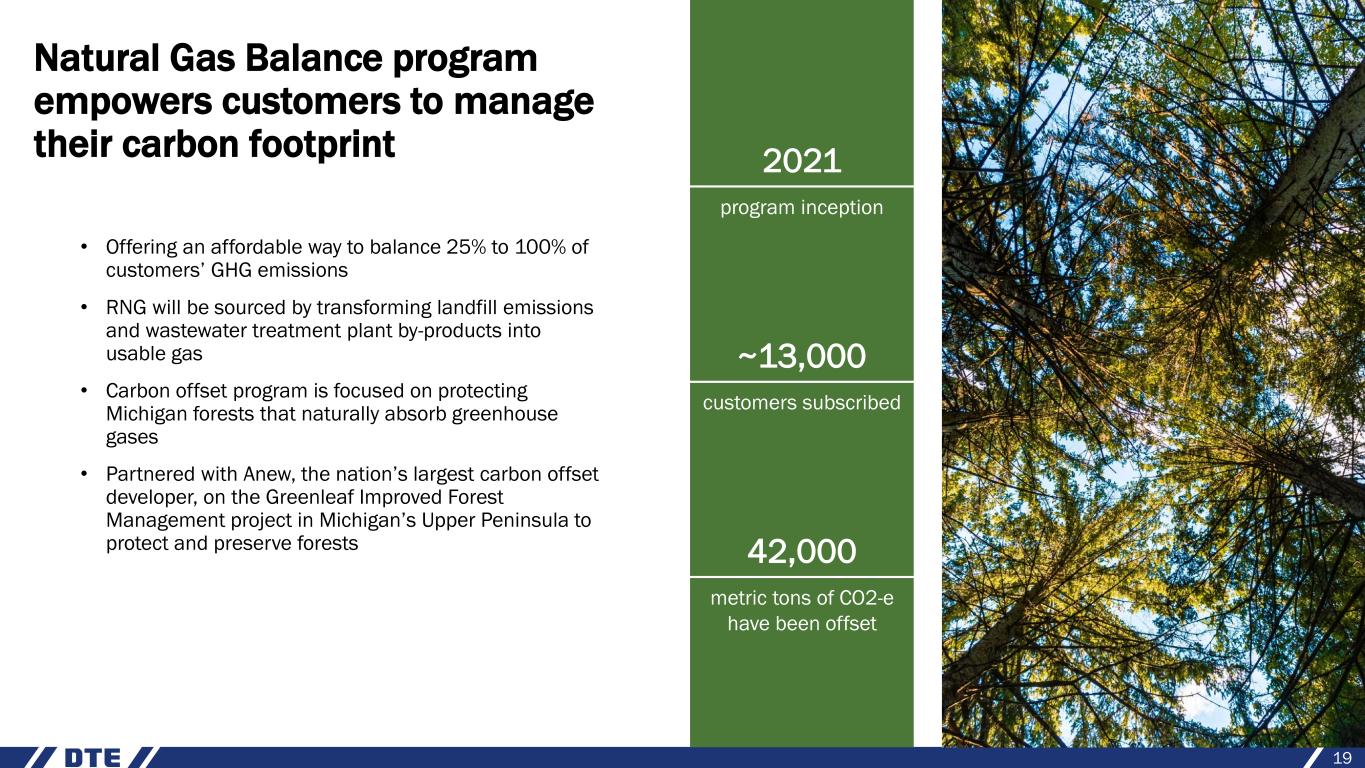 MIGreenPower program continues significant growth 1,830 business customers 99,400 residential customers 2,440 MW subscribed • Allows customers to attribute up to 100% of electricity use to renewable sources • Recognized by National Renewable Energy Laboratory as having the largest Green Tariff program in the country, fulfilling more load under contracted subscriptions than any other program • Two largest renewable energy purchases from a utility announced with Ford Motor Company and Stellantis Voluntary renewable customers 18