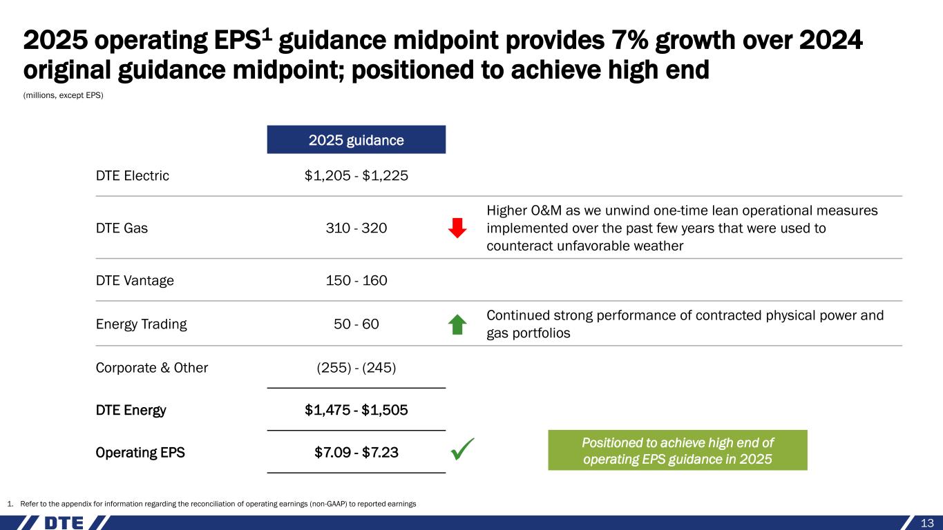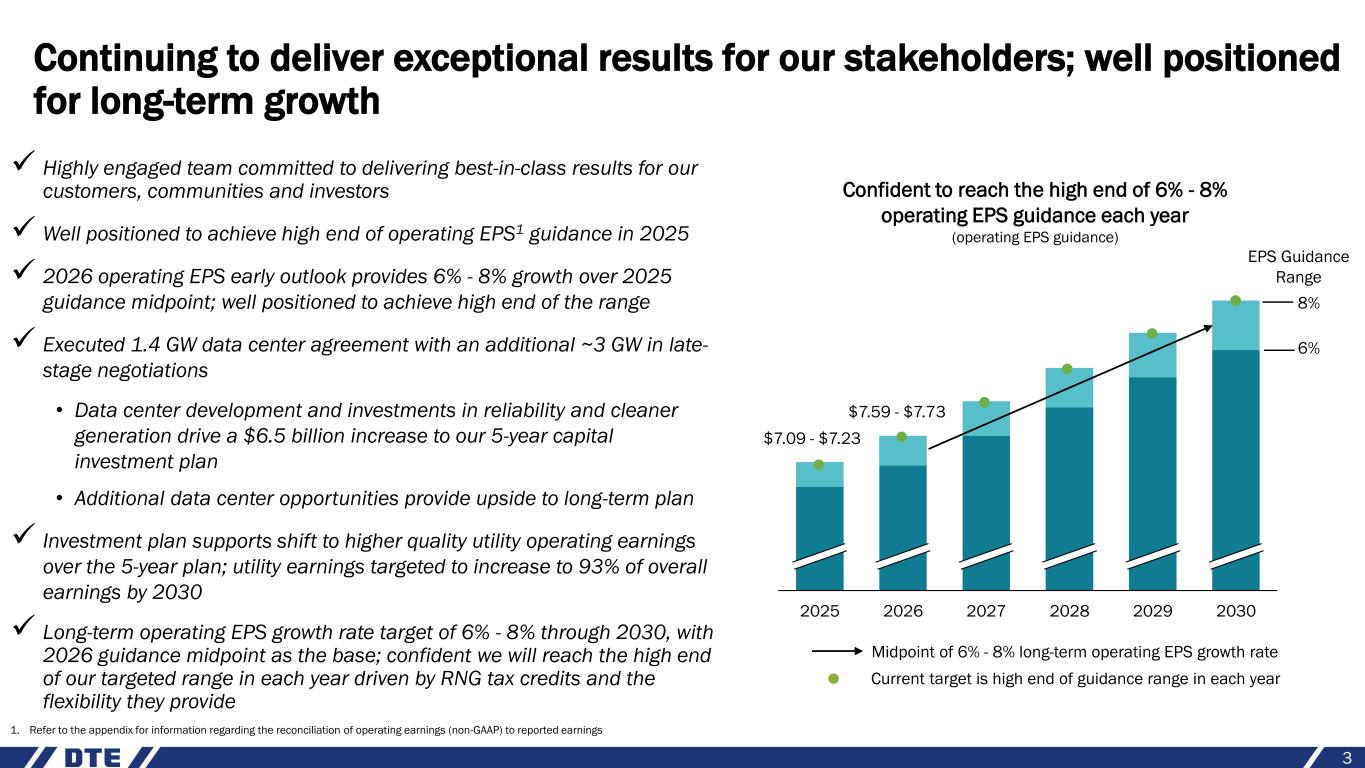 Safe harbor statement 2 The information contained herein is as of the date of this document. DTE Energy expressly disclaims any current intention to update any forward-looking statements contained in this document as a result of new information or future events or developments. Words such as “anticipate,” “believe,” “expect,” “may,” “could,” “projected,” “aspiration,” “plans” and “goals” signify forward-looking statements. Forward-looking statements are not guarantees of future results and conditions but rather are subject to various assumptions, risks and uncertainties that may cause actual future results to be materially different from those contemplated, projected, estimated or budgeted. Many factors may impact forward-looking statements including, but not limited to, the following: the impact of regulation by the EPA, EGLE, the FERC, the MPSC, the NRC, and for DTE Energy, the CFTC and CARB, as well as other applicable governmental proceedings and regulations, including any associated impact on rate structures; the amount and timing of cost recovery allowed as a result of regulatory proceedings, related appeals, or new legislation, including legislative amendments and retail access programs; economic conditions and population changes in our geographic area resulting in changes in demand, customer conservation, and thefts of electricity and, for DTE Energy, natural gas; the operational failure of electric or gas distribution systems or infrastructure; impact of volatility in prices in international steel markets and in prices of environmental attributes generated from renewable natural gas investments on the operations of DTE Vantage; the risk of a major safety incident; environmental issues, laws, regulations, and the increasing costs of remediation and compliance, including actual and potential new federal and state requirements; the cost of protecting assets and customer data against, or damage due to, cyber incidents and terrorism; health, safety, financial, environmental, and regulatory risks associated with ownership and operation of nuclear facilities; volatility in commodity markets, deviations in weather and related risks impacting the results of DTE Energy’s energy trading operations; changes in the cost and availability of coal and other raw materials, purchased power, and natural gas; advances in technology that produce power, store power or reduce or increase power consumption; changes in the financial condition of significant customers and strategic partners; the potential for losses on investments, including nuclear decommissioning trust and benefit plan assets and the related increases in future expense and contributions; access to capital markets and the results of other financing efforts which can be affected by credit agency ratings; instability in capital markets which could impact availability of short and long-term financing; impacts of inflation, tariffs, and the timing and extent of changes in interest rates; the level of borrowings; the potential for increased costs or delays in completion of significant capital projects; changes in, and application of, federal, state, and local tax laws and their interpretations, including the Internal Revenue Code, regulations, rulings, court proceedings, and audits; the effects of weather and other natural phenomena, including climate change, on operations and sales to customers, and purchases from suppliers; unplanned outages at our generation plants; employee relations and the impact of collective bargaining agreements; the availability, cost, coverage, and terms of insurance and stability of insurance providers; cost reduction efforts and the maximization of generation and distribution system performance; the effects of competition; changes in and application of accounting standards and financial reporting regulations; changes in federal or state laws and their interpretation with respect to regulation, energy policy, and other business issues; successful execution of new business development and future growth plans; contract disputes, binding arbitration, litigation, and related appeals; the ability of the electric and gas utilities to achieve goals for carbon emission reductions; and the risks discussed in DTE Energy’s public filings with the Securities and Exchange Commission. New factors emerge from time to time. We cannot predict what factors may arise or how such factors may cause results to differ materially from those contained in any forward-looking statement. Any forward-looking statements speak only as of the date on which such statements are made. We undertake no obligation to update any forward-looking statement to reflect events or circumstances after the date on which such statement is made or to reflect the occurrence of unanticipated events. This document should also be read in conjunction with the Forward-Looking Statements section in DTE Energy’s public filings with the Securities and Exchange Commission.