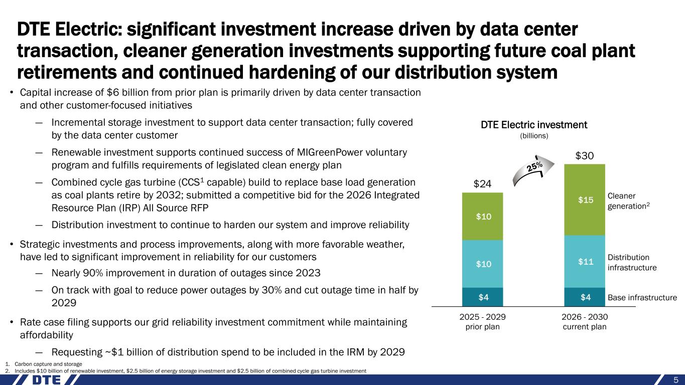 Data center development and investments in reliability and cleaner generation drive a $6.5 billion increase to our 5-year capital investment plan 4 1. Refer to the appendix for information regarding the reconciliation of operating earnings (non-GAAP) to reported earnings $24 $4 ~$2 2025 - 2029 prior plan 2026 - 2030 current plan $30 $36.5 DTE Electric DTE Gas DTE Vantage22 % 5-year investment plan (billions) ~$2 $4.5 $30 • DTE Electric investments support data center development, cleaner generation transformation and distribution investments focused on continued reliability improvements — Additional data center opportunities provide upside to long-term plan • DTE Gas capital investment plan supports system reliability and infrastructure renewal • DTE Vantage will continue to focus on investments in utility-like, long-term, fixed-fee contracted projects • Investment plan supports operating EPS1 growth rate target of 6% - 8% through 2030; confident we will reach the high end of our targeted range in each year driven by RNG tax credits and the flexibility they provide — Utility operating earnings targeted to increase to 93% of overall earnings by 2030 — Data center opportunities help support this strategic shift, mitigating the impact of a more conservative DTE Vantage growth outlook driven largely by commodity pricing assumptions