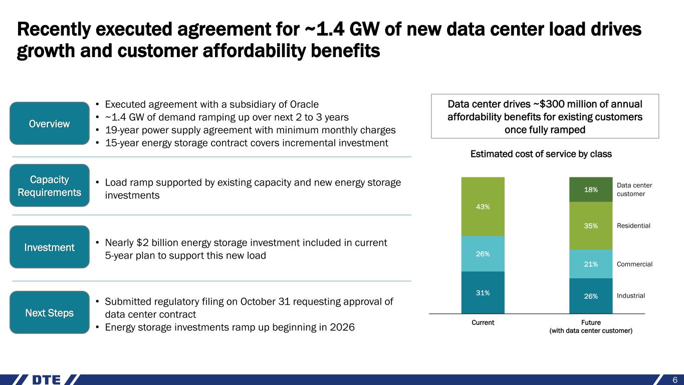 • Capital increase of $6 billion from prior plan is primarily driven by data center transaction and other customer-focused initiatives — Incremental storage investment to support data center transaction; fully covered by the data center customer — Renewable investment supports continued success of MIGreenPower voluntary program and fulfills requirements of legislated clean energy plan — Combined cycle gas turbine (CCS1 capable) build to replace base load generation as coal plants retire by 2032; submitted a competitive bid for the 2026 Integrated Resource Plan (IRP) All Source RFP — Distribution investment to continue to harden our system and improve reliability • Strategic investments and process improvements, along with more favorable weather, have led to significant improvement in reliability for our customers — Nearly 90% improvement in duration of outages since 2023 — On track with goal to reduce power outages by 30% and cut outage time in half by 2029 • Rate case filing supports our grid reliability investment commitment while maintaining affordability — Requesting ~$1 billion of distribution spend to be included in the IRM by 2029 5 DTE Electric: significant investment increase driven by data center transaction, cleaner generation investments supporting future coal plant retirements and continued hardening of our distribution system $4 $4 $10 $11 $10 $15 2025 - 2029 prior plan 2026 - 2030 current plan Base infrastructure Cleaner generation2 $24 DTE Electric investment (billions) $30 25 % Distribution infrastructure 1. Carbon capture and storage 2. Includes $10 billion of renewable investment, $2.5 billion of energy storage investment and $2.5 billion of combined cycle gas turbine investment